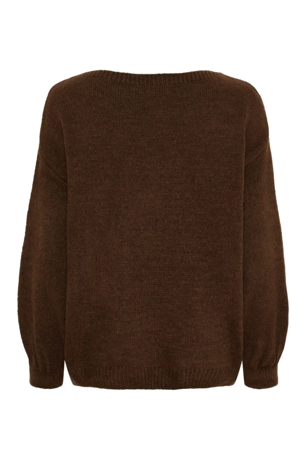 Brun strik fra Marta Du Chateau med hjerteformede mønstre på forsiden i grå og bordeaux. Bagsiden er ensfarvet brun uden mønstre.