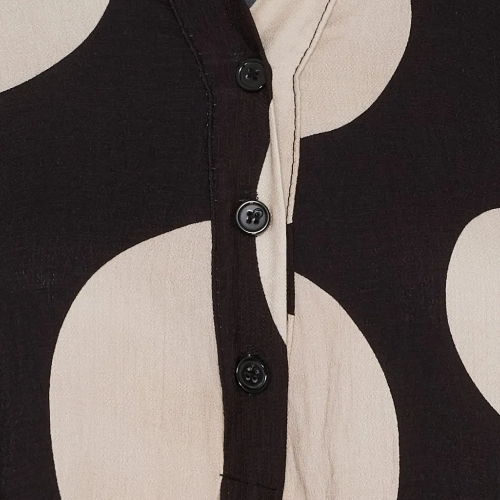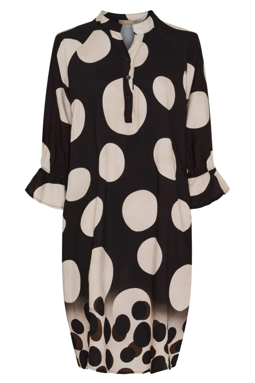 Sort kjole fra Marta Du Chateau med store beige prikker. Kjolen har en løs pasform og går til knæet. Den er lavet med trekvartlange ærmer og en skjortekrave med knapper.