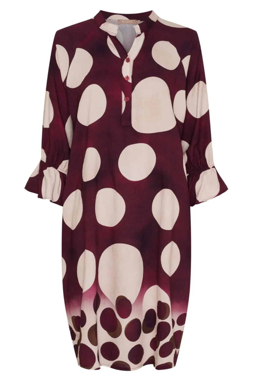 Kjole fra Marta Du Chateau i bordeaux med store hvide prikker og en ombre-effekt i bunden. Kjolen har skjortekrave, 3/4-ærmer med flæser og knapper foran.