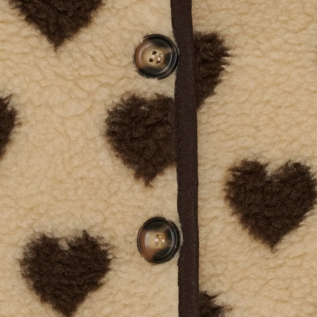 En vest fra Marta Du Chateau med et mønster af mørke hjerter på en lys beige baggrund. Vesten har mørke kanter og en V-hals.