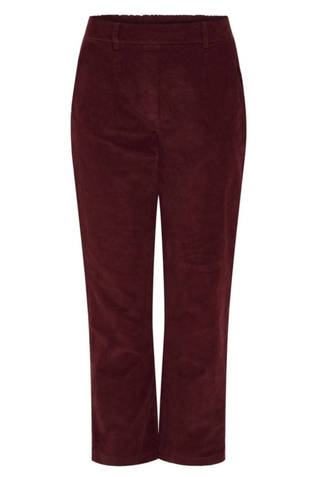 Bordeauxfarvede bukser fra Marta Du Chateau. Bukserne har en almindelig taljehøjde og en elastisk talje med bæltestropper. Den dybe bordeauxfarve giver et markant look.