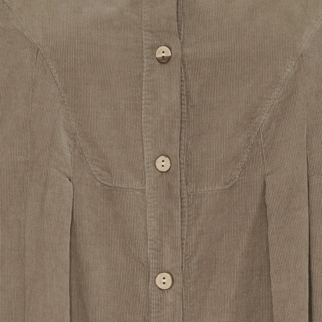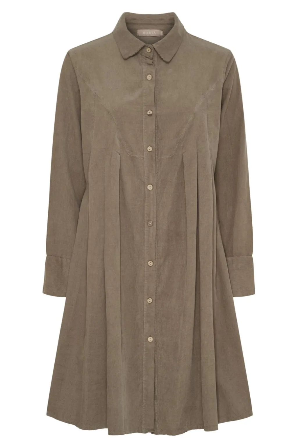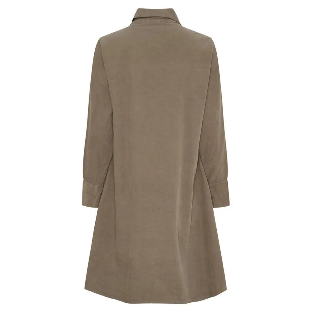 Skjortekjole fra Marta Du Chateau i en grønbrun fango-farve. Den knælange kjole har en gennemgående knaplukning foran og opsmøgede ærmer med manchetter.