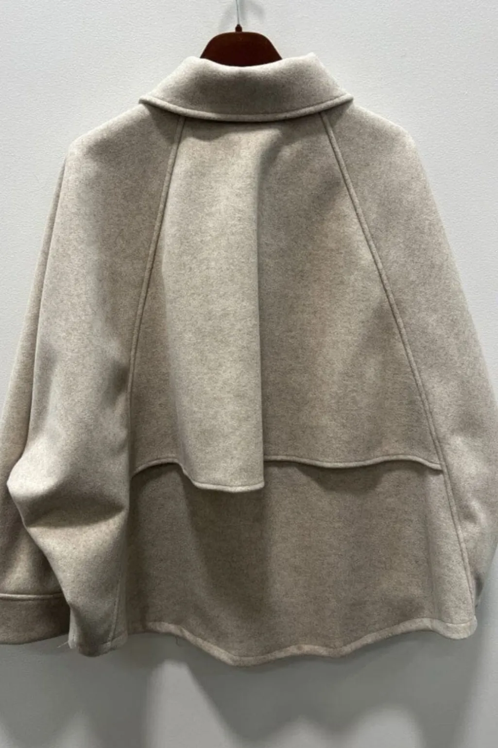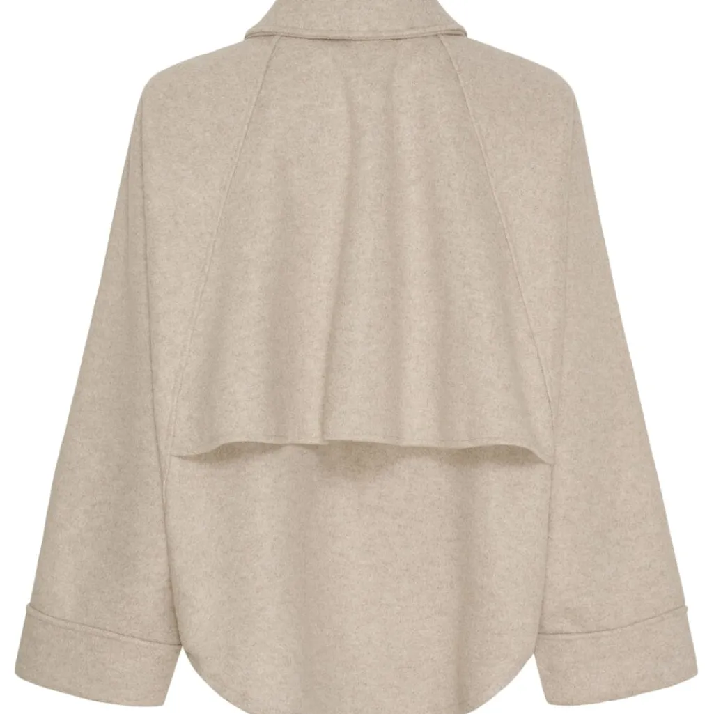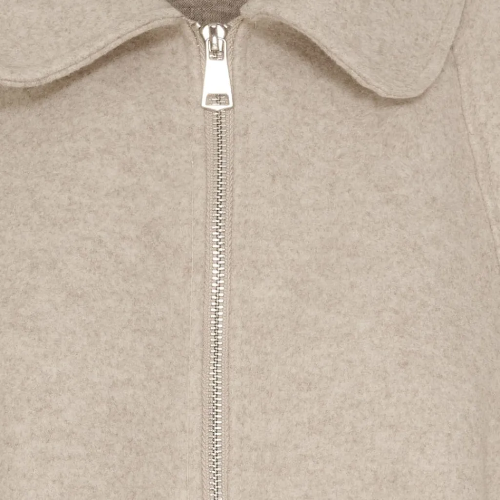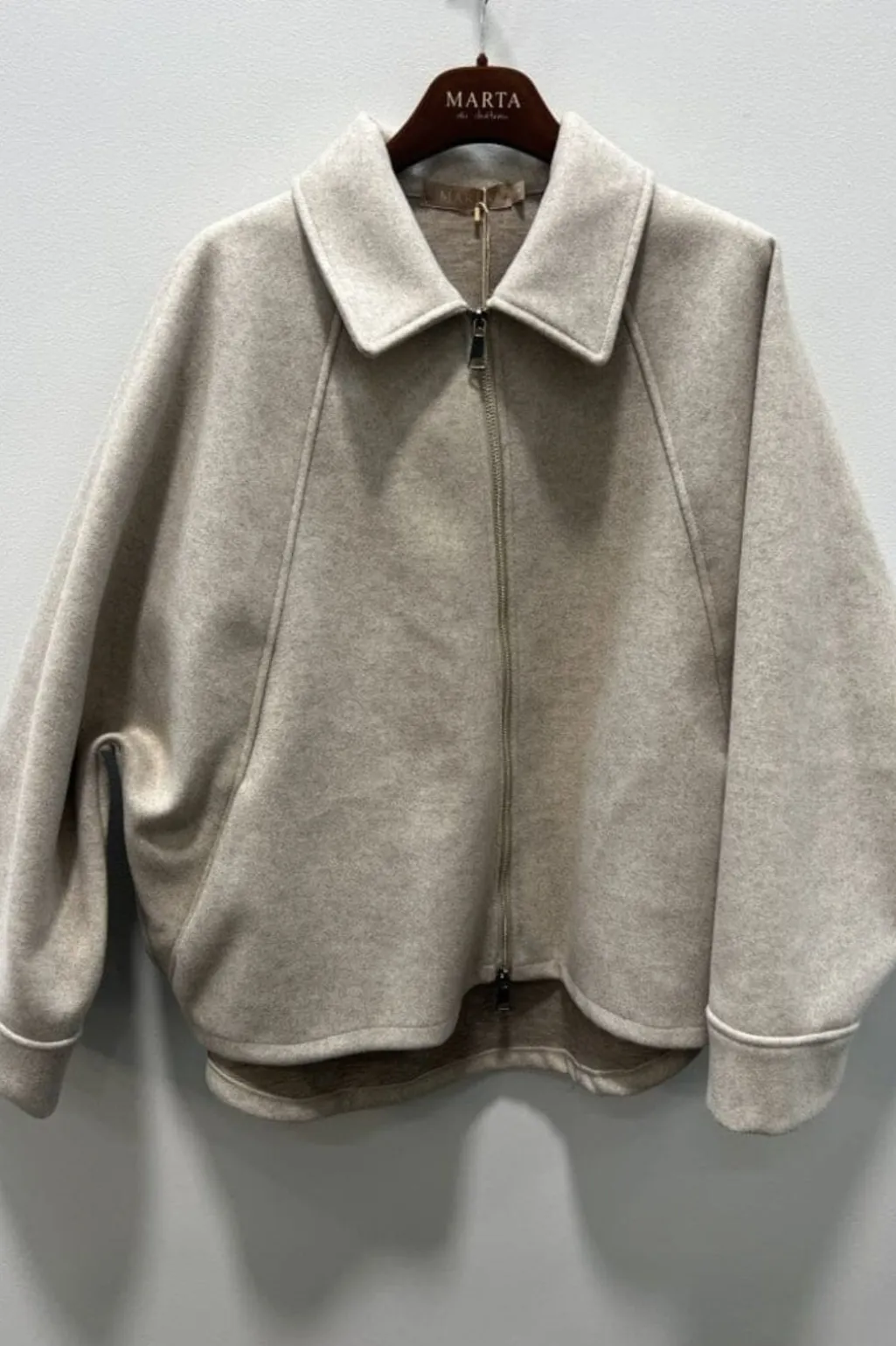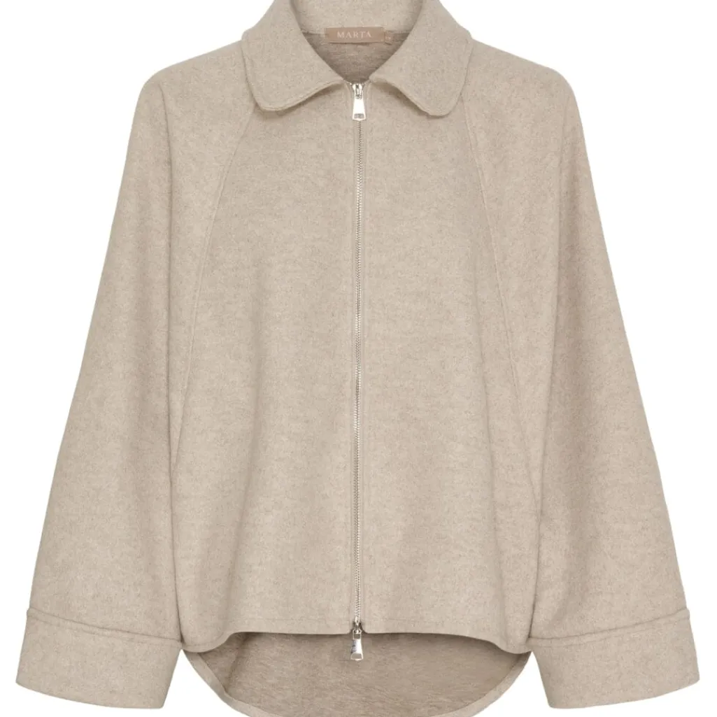 Beige jakke fra Marta Du Chateau med skjortekrave og oversized pasform. Jakken har 3/4-ærmer og lynlåslukning foran.