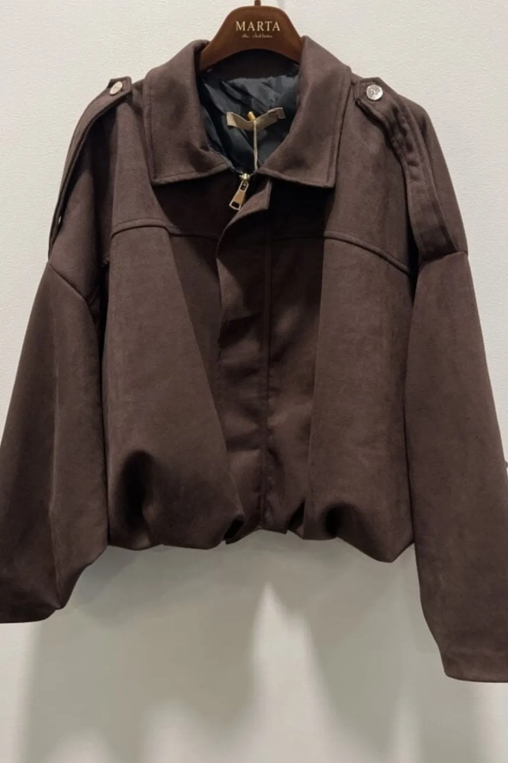 Brun jakke fra Marta Du Chateau med klassisk skjortekrave og oversized pasform. Jakken har dekorative syninger og lukkes med både lynlås og elastik.