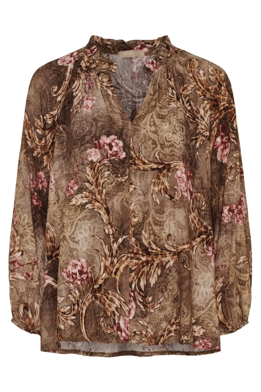 Bluse fra Marta du Château i 100% viskose med blomstret paisley-print i brune, beige og lyserøde nuancer.