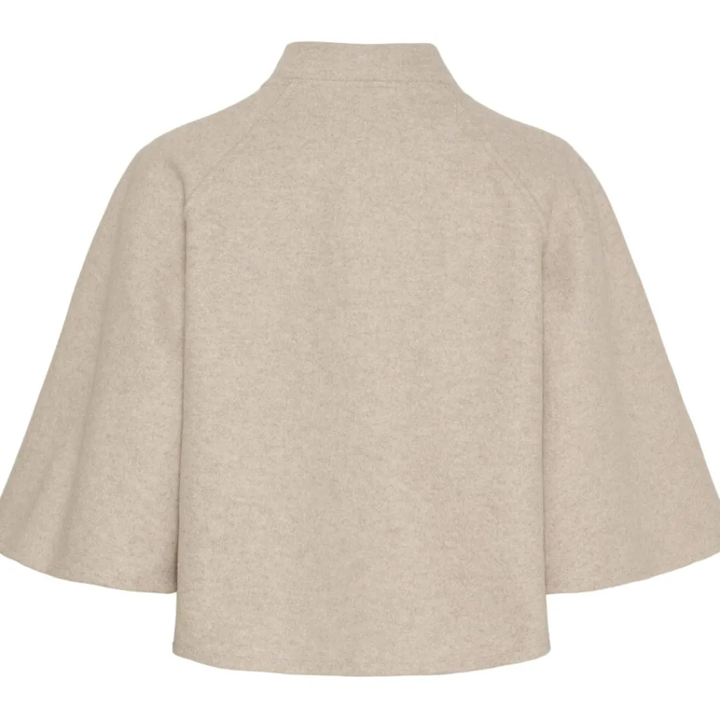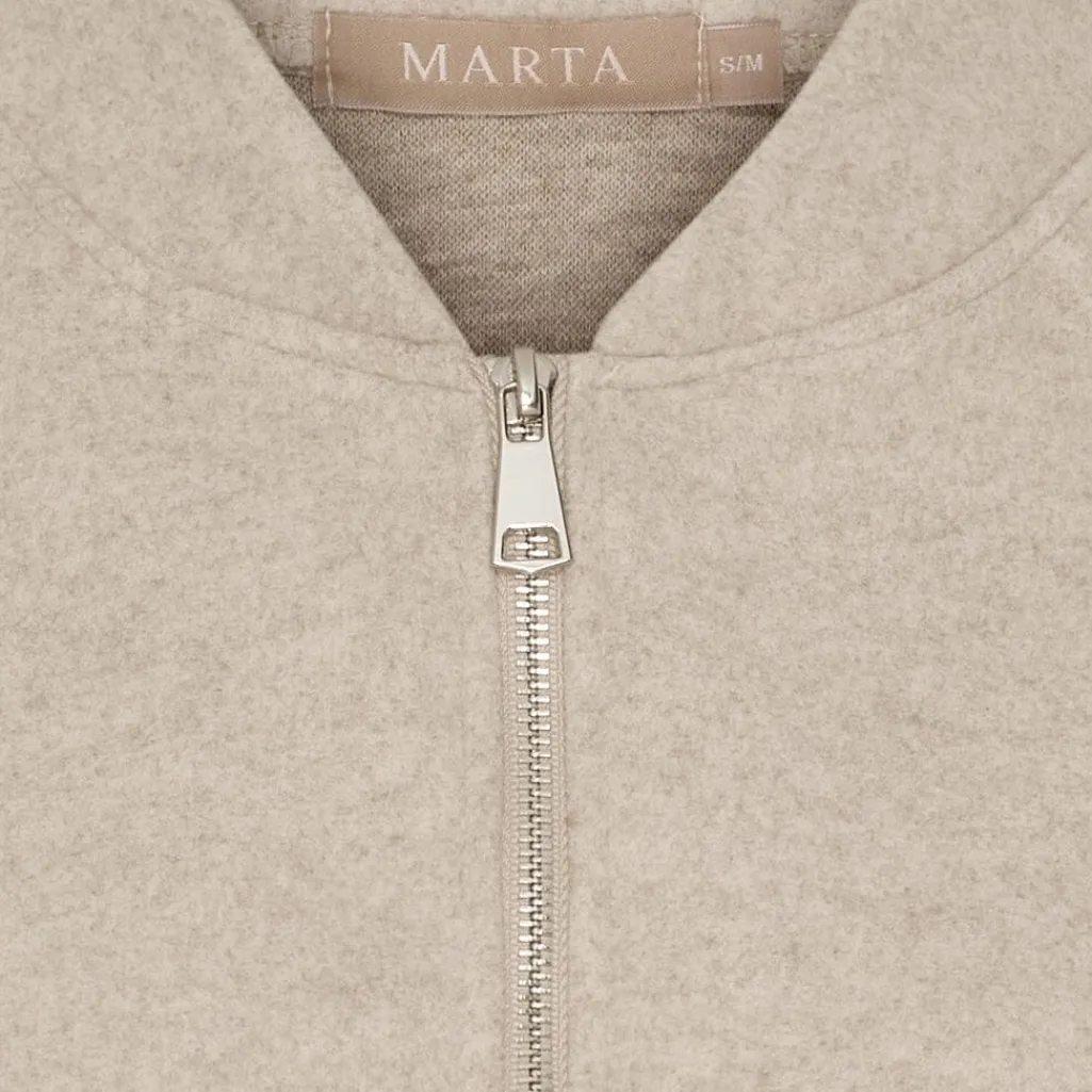 Beige jakke fra Marta Du Chateau med synlig lynlås foran, høj krave og dekorative syninger. Jakken har en løs pasform og 3/4-ærmer.