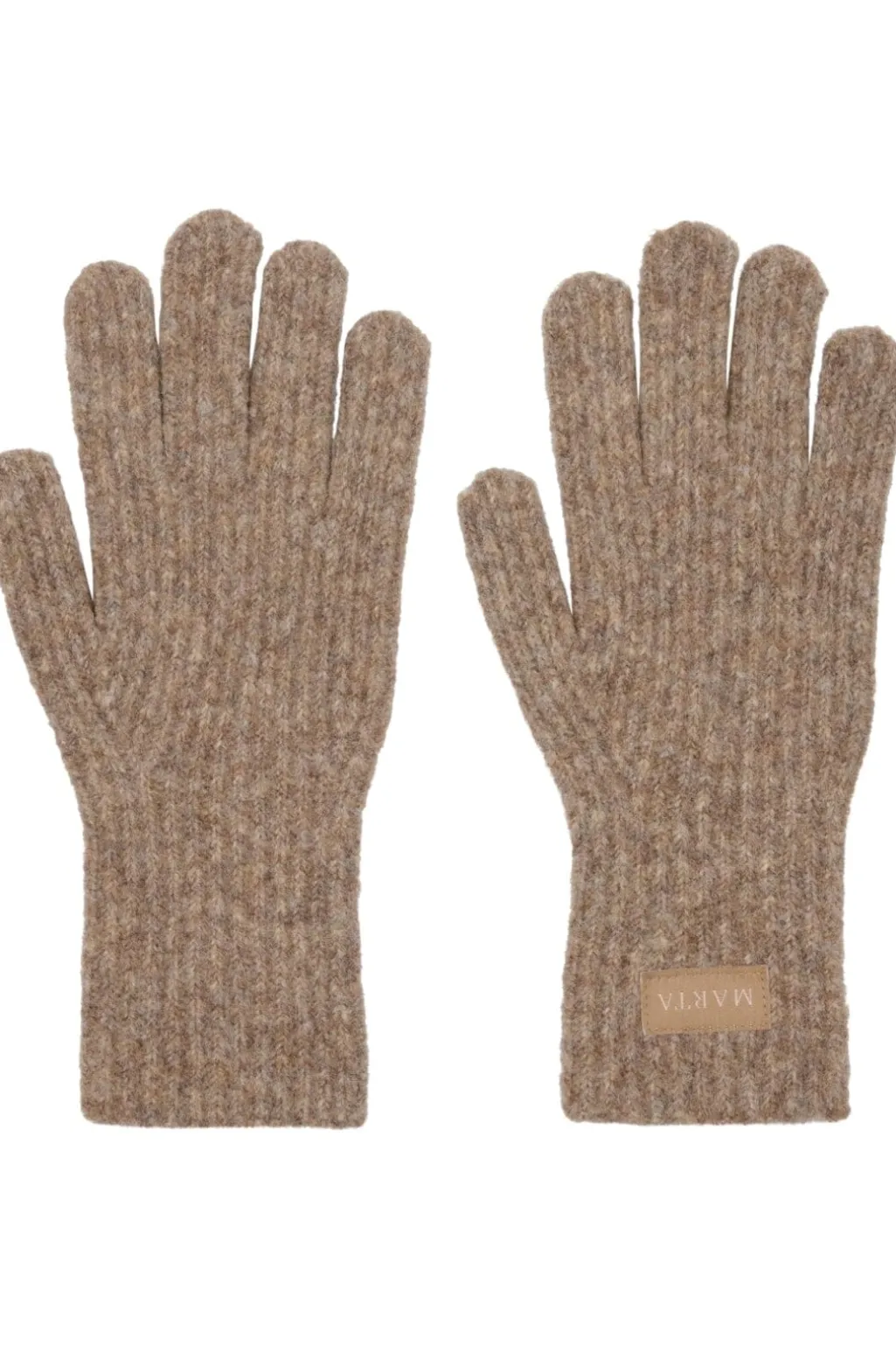Strikkede handsker fra Marta Du Chateau i en brun og beige nuance. Handskerne har en strikket tekstur med et marlet mønster og et femfingerdesign.