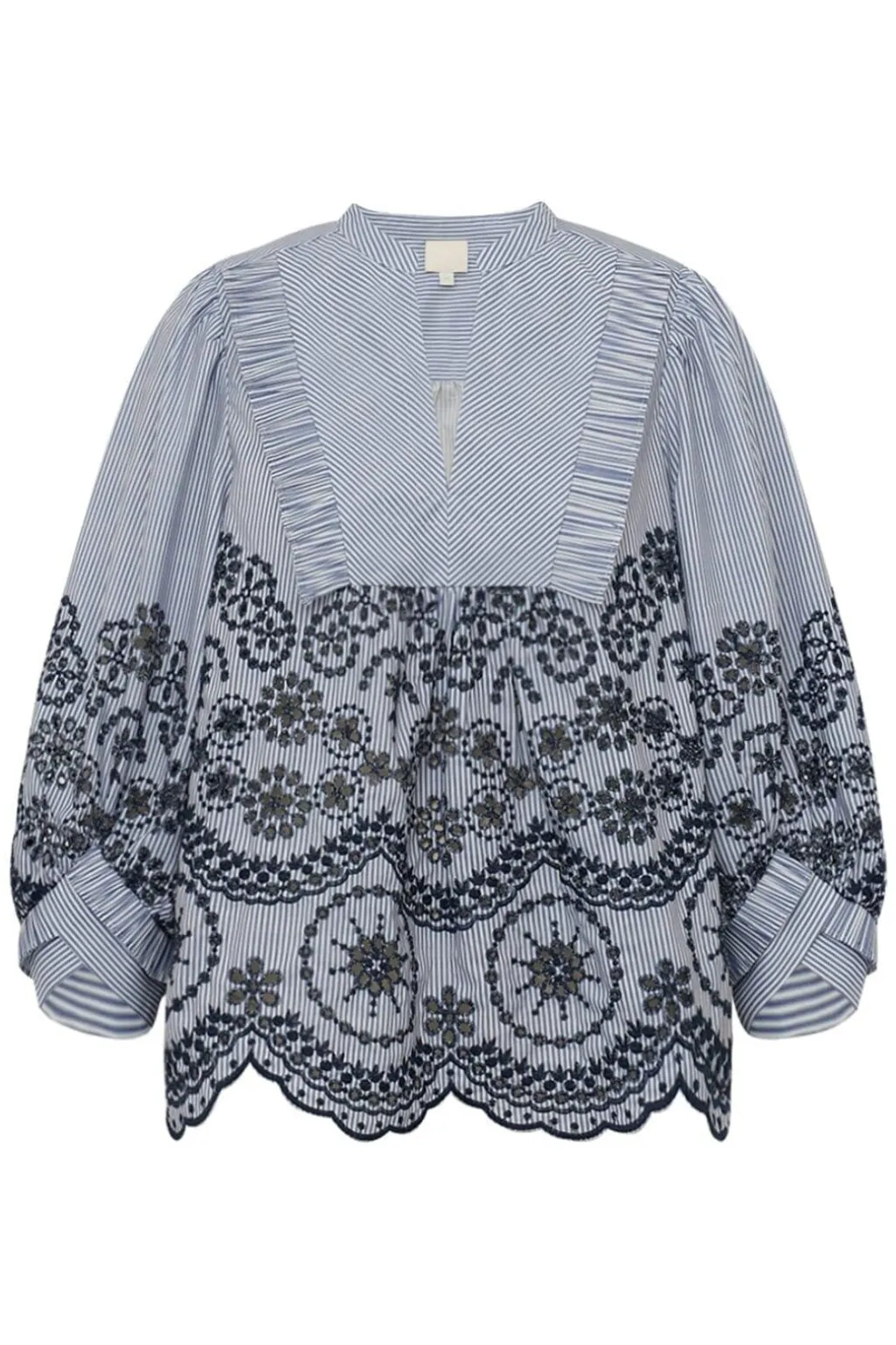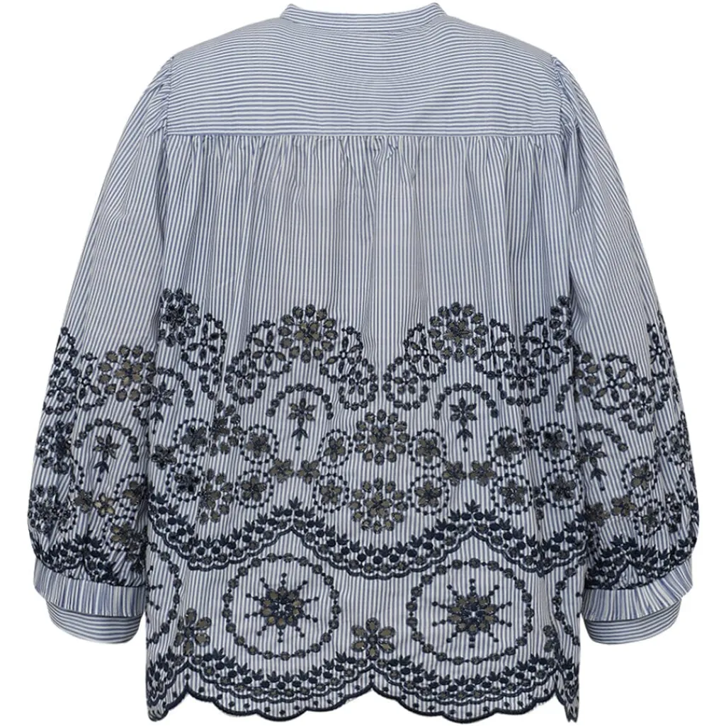 Blåstribet bluse fra Gossia med blomsterbroderi. Den har en V-udskæring med flæsekant og puffede lange ærmer. Blusen kombinerer striber med dekorativt broderi og blondedetaljer.