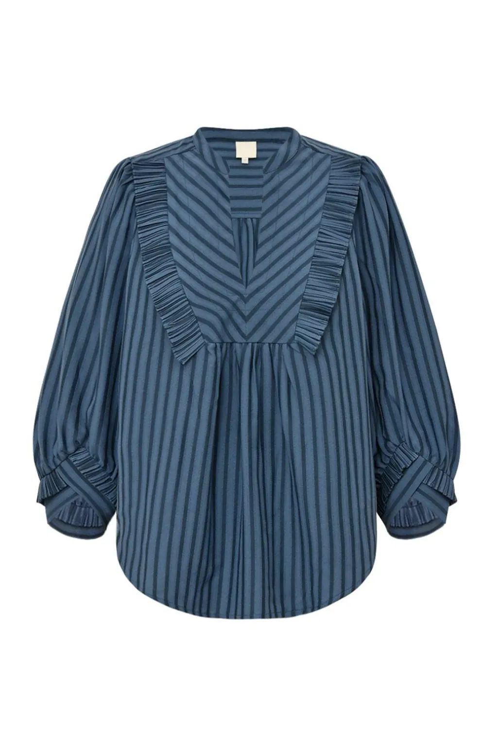 Blåstribet bluse fra Gossia, lavet af en polyester-/viskoseblanding. Materialet er jacquardvævet med lodrette blå striber på kroppen.