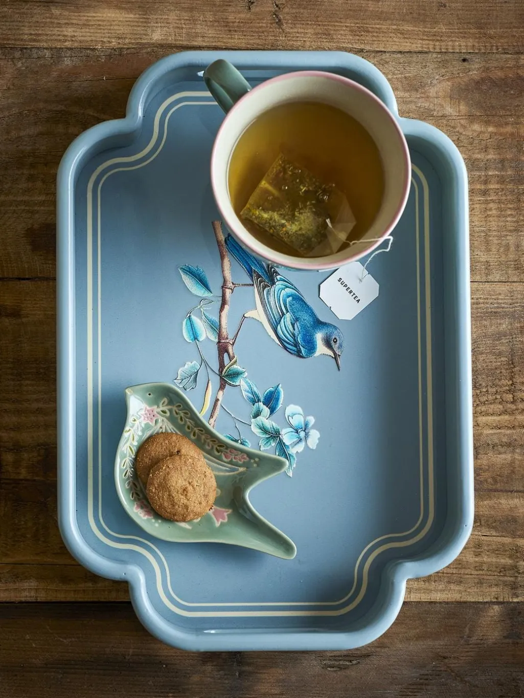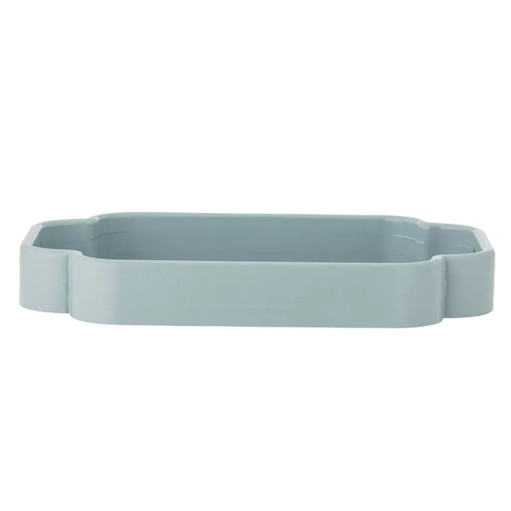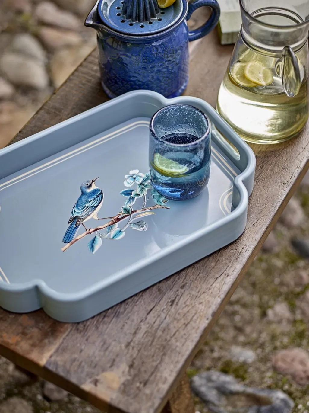 Blåt fad fra Bloomingville med et detaljeret motiv af en fugl på en blomstrende gren. Fadet er lavet af MDF og har afrundede hjørner.