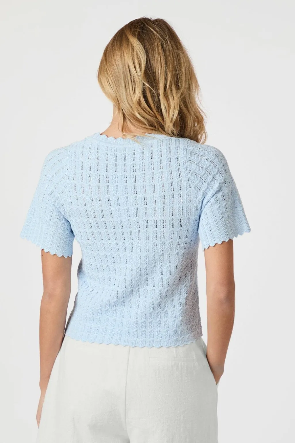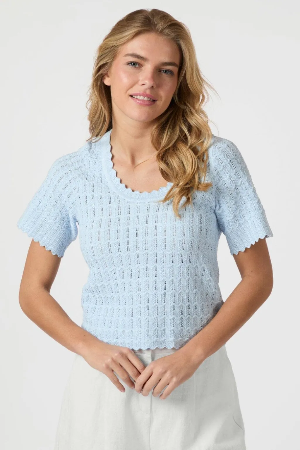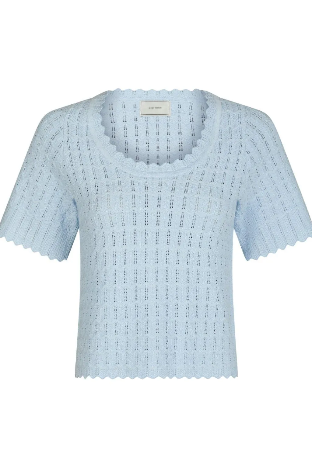 Lyseblå strikbluse fra Neo Noir med zigzagmønster. Blusen har en bølget rund halsudskæring og korte ærmer med bølgede kanter.