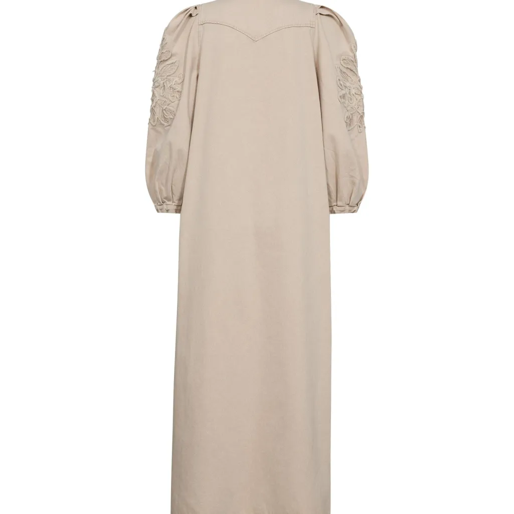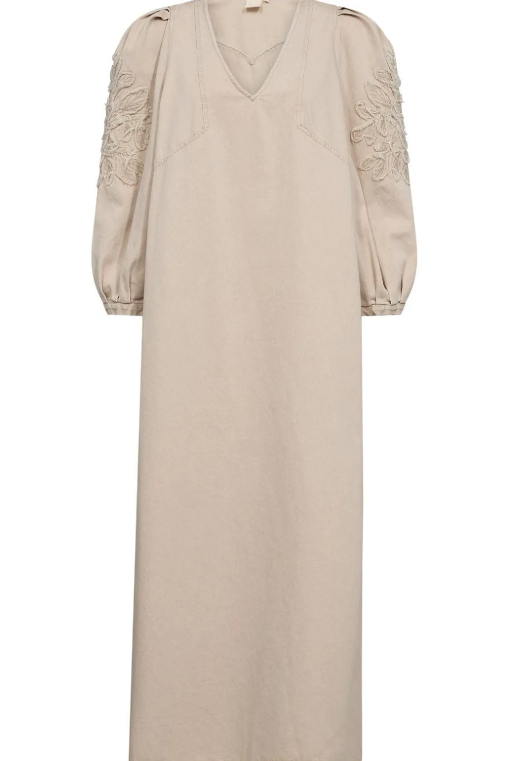 En cremefarvet kjole fra Gossia, lavet af bomuld. Kjolen har V-udskæring, 3/4 ærmer med broderi og en lang længde.