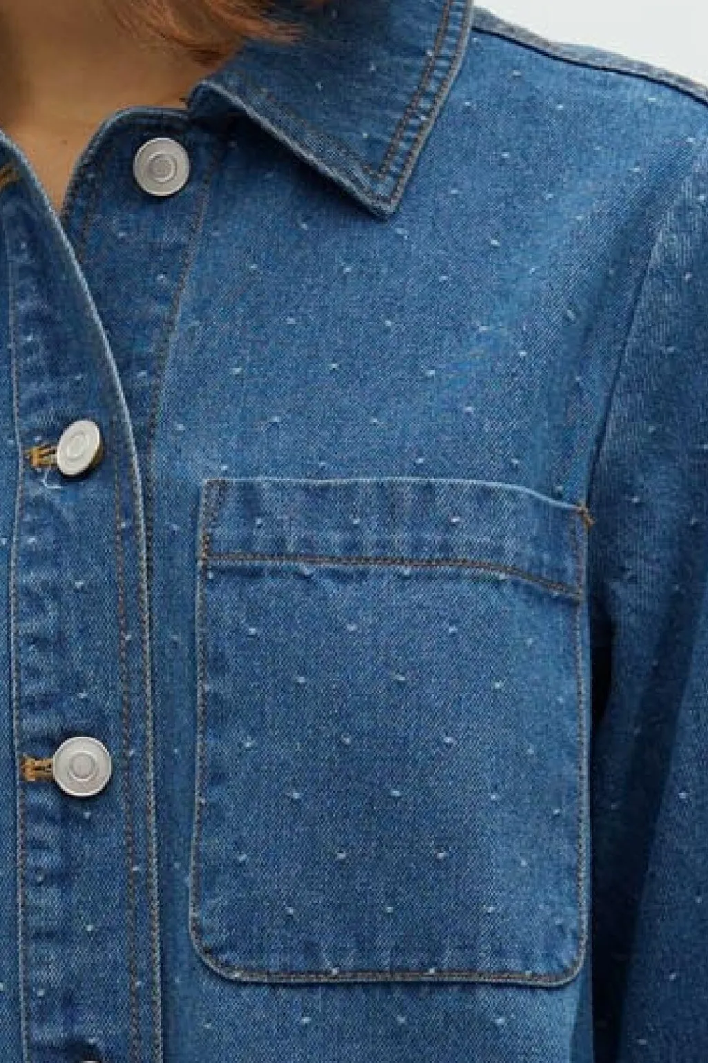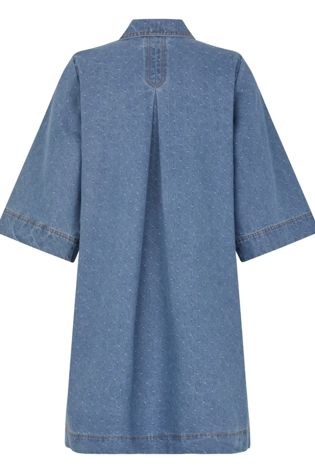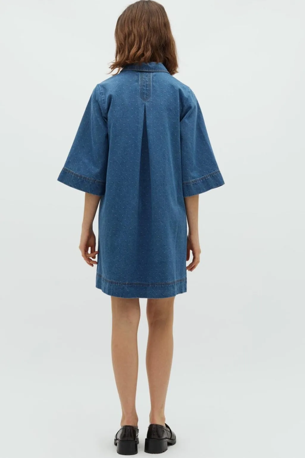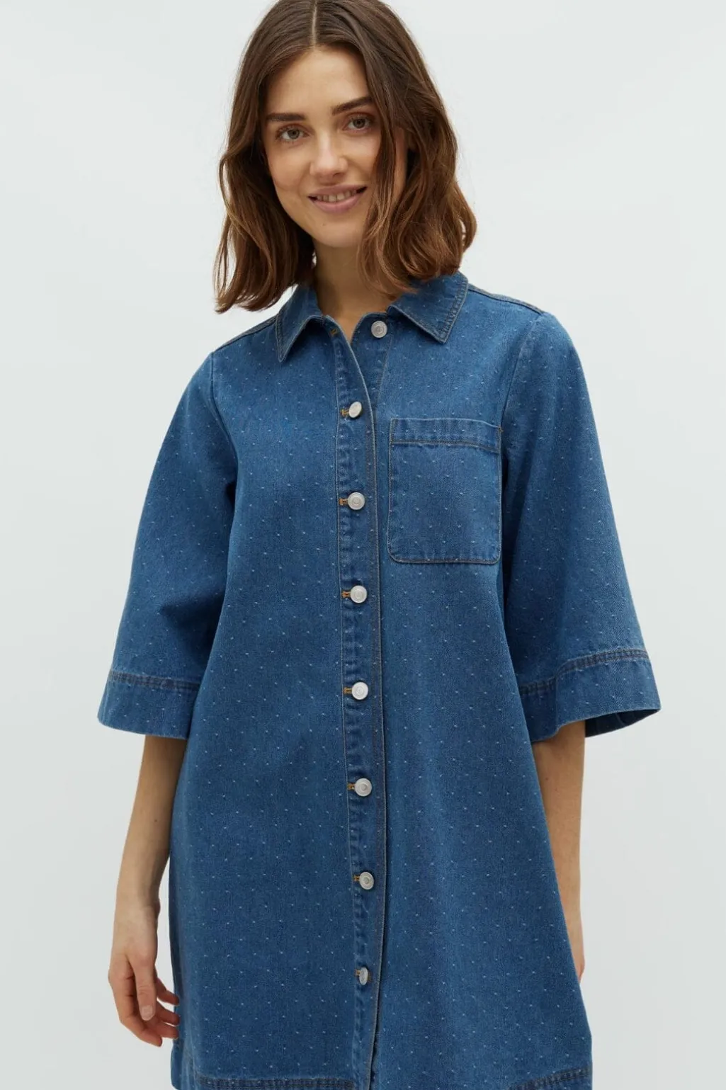 Denimkjole fra Global Funk med polkaprikker i blå nuancer. Kjolen har skjortekrave, knaplukning foran og en brystlomme samt 3/4-lange ærmer.