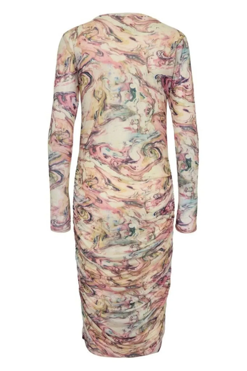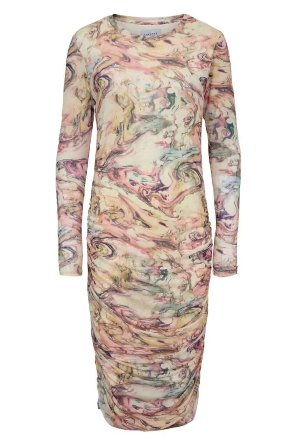 Langærmet kjole fra Liberte med marmoreret mønster i nuancer af pink, fløde og blå. Kjolen har rynkede detaljer langs siderne og en rund halsudskæring.
