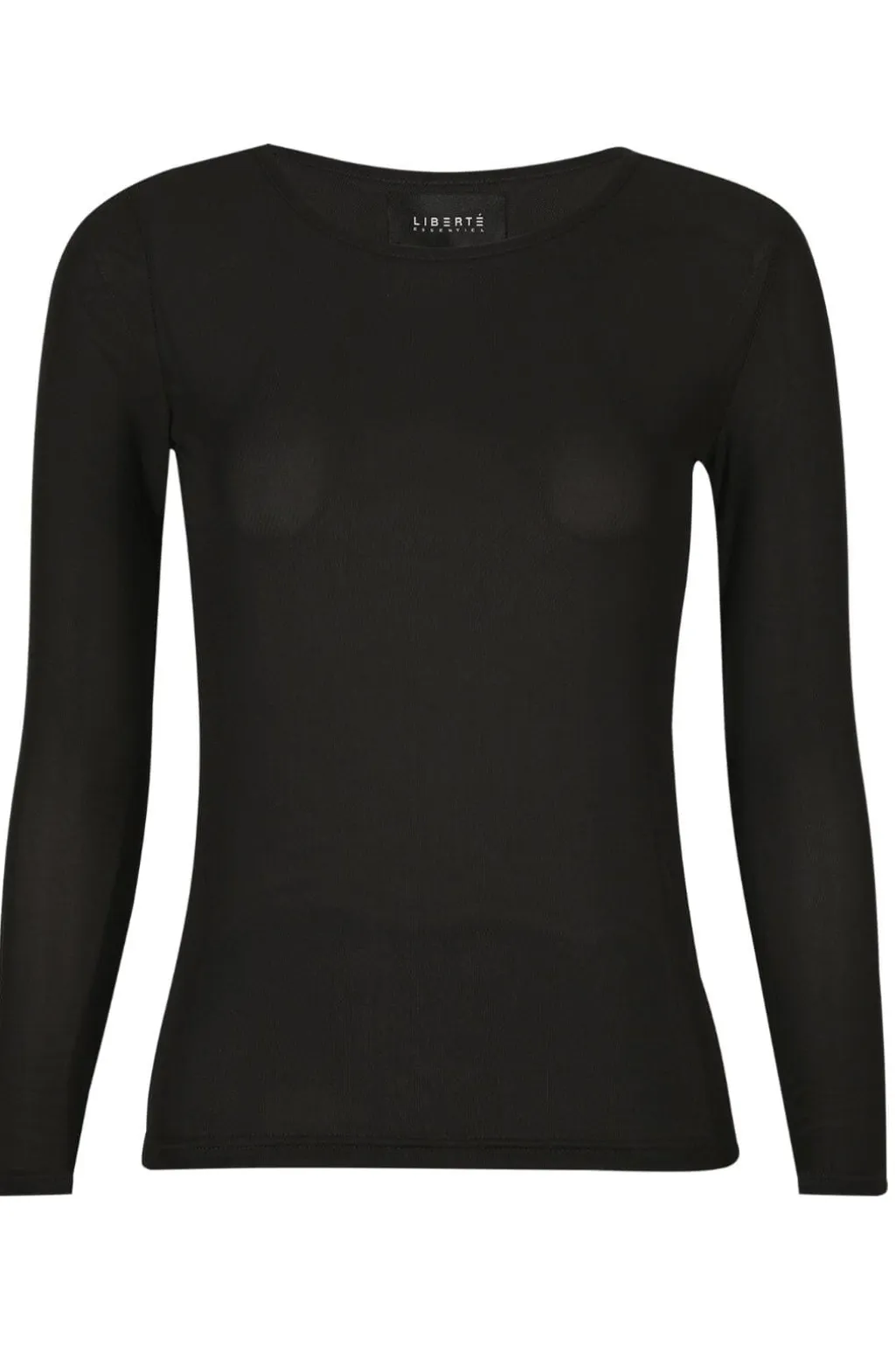 Sort meshtrøje fra Liberte med lange ærmer og rund halsudskæring. Meshdesignet giver en let gennemsigtig effekt.
