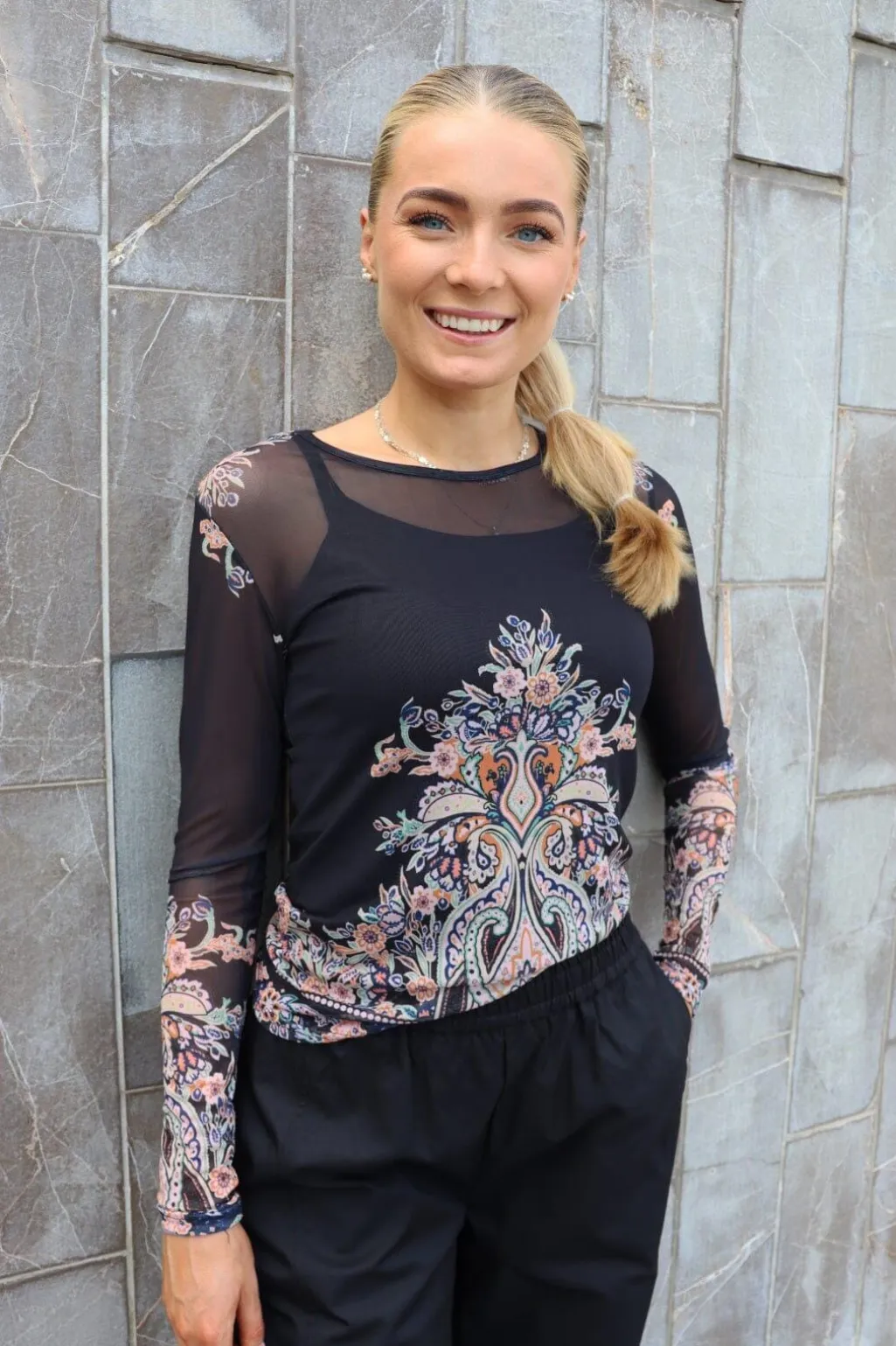 En mesh-t-shirt fra Liberte med paisley-mønster på sort bund. T-shirten passer til både afslappede hverdage og festlige lejligheder.