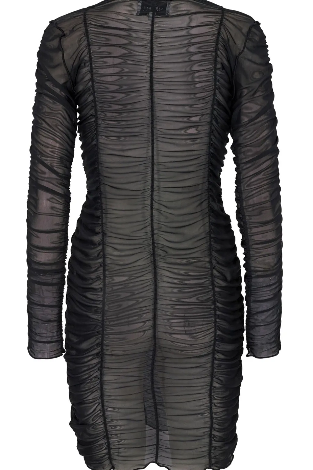 Sort meshkjole med rynket design fra Liberte. Den tætsiddende kjole har lange ærmer og høj hals, lavet i et let, gennemsigtigt materiale med struktur.