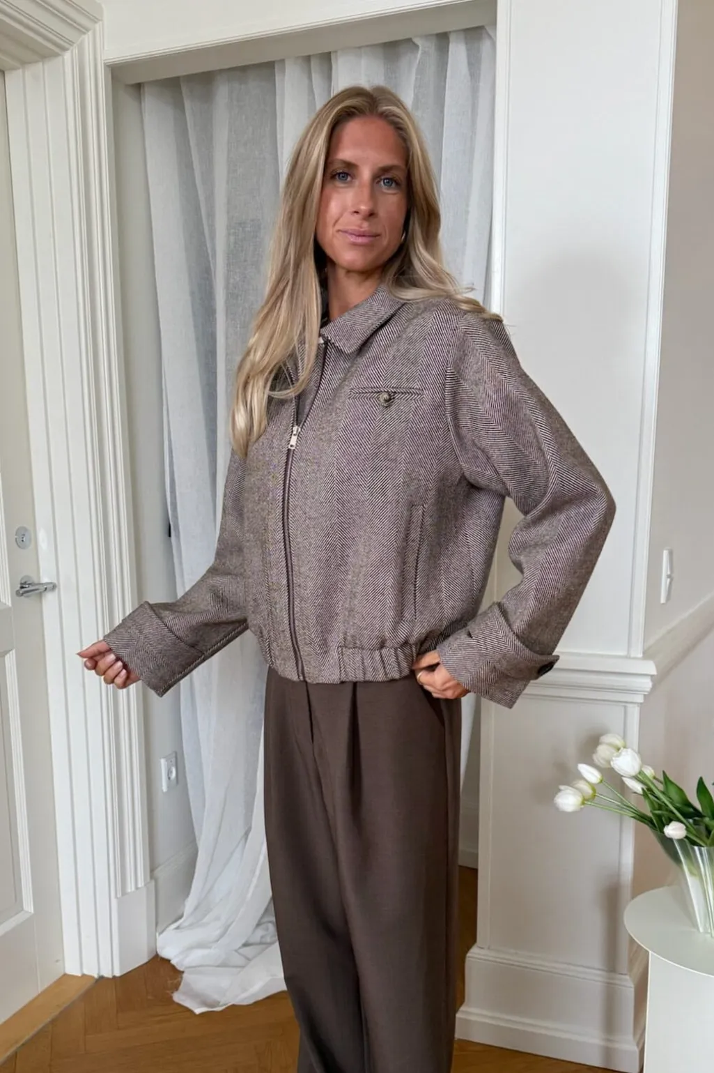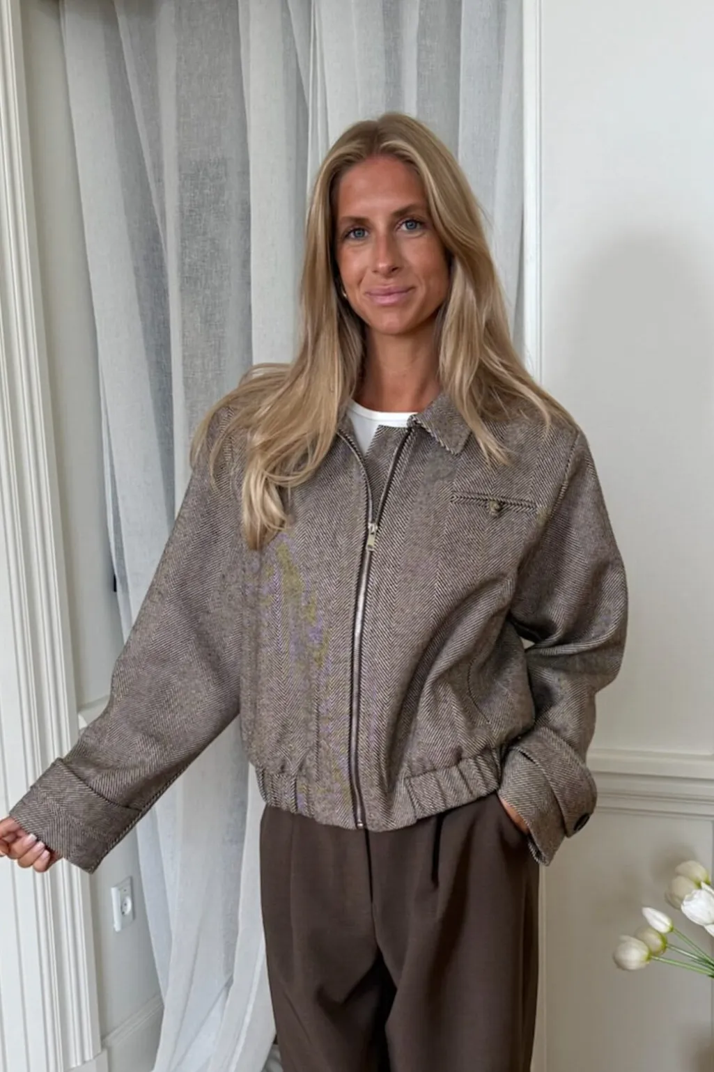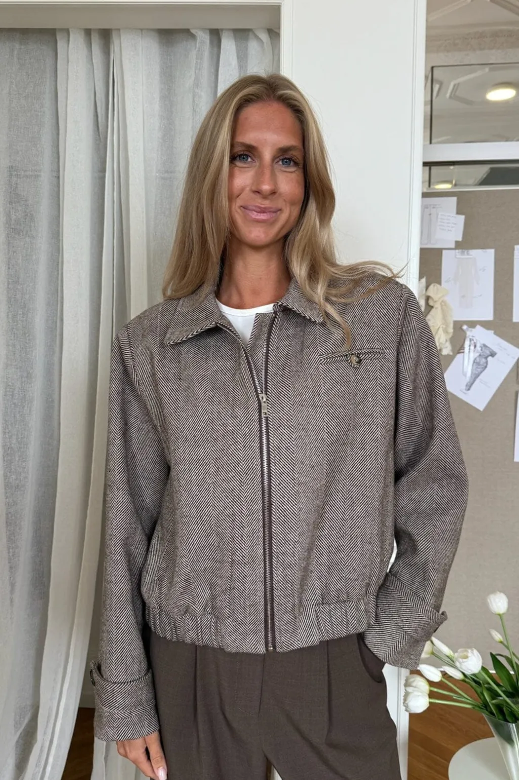Kort jakke fra BYIC med brunt herringbone-mønster. Jakken har en høj krave, der kan foldes ned, og en elastisk talje med let puffet silhuet.