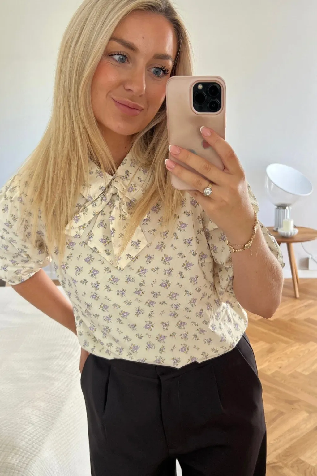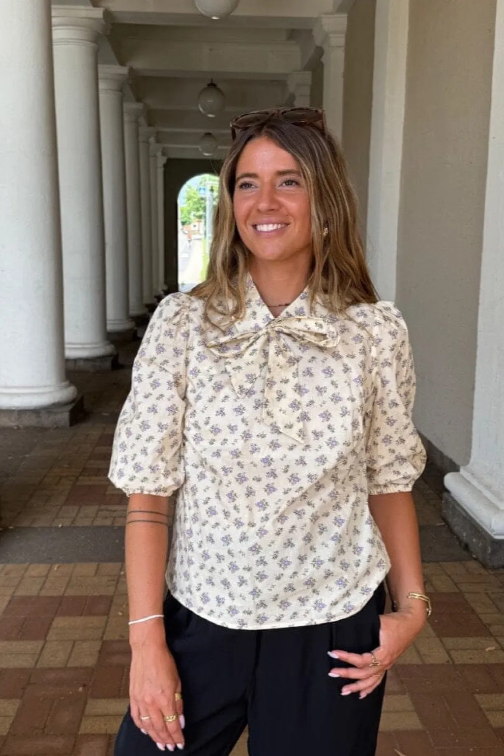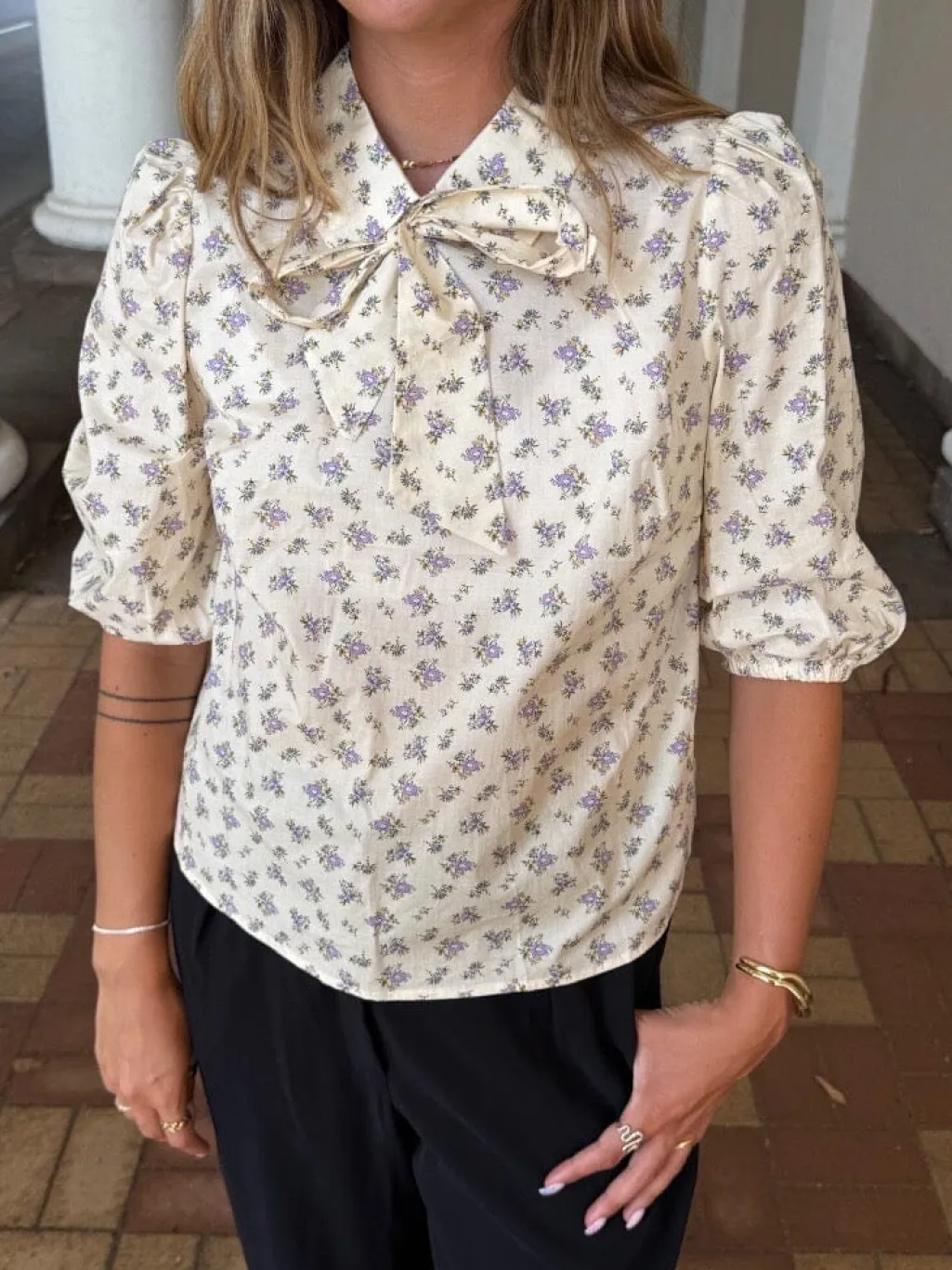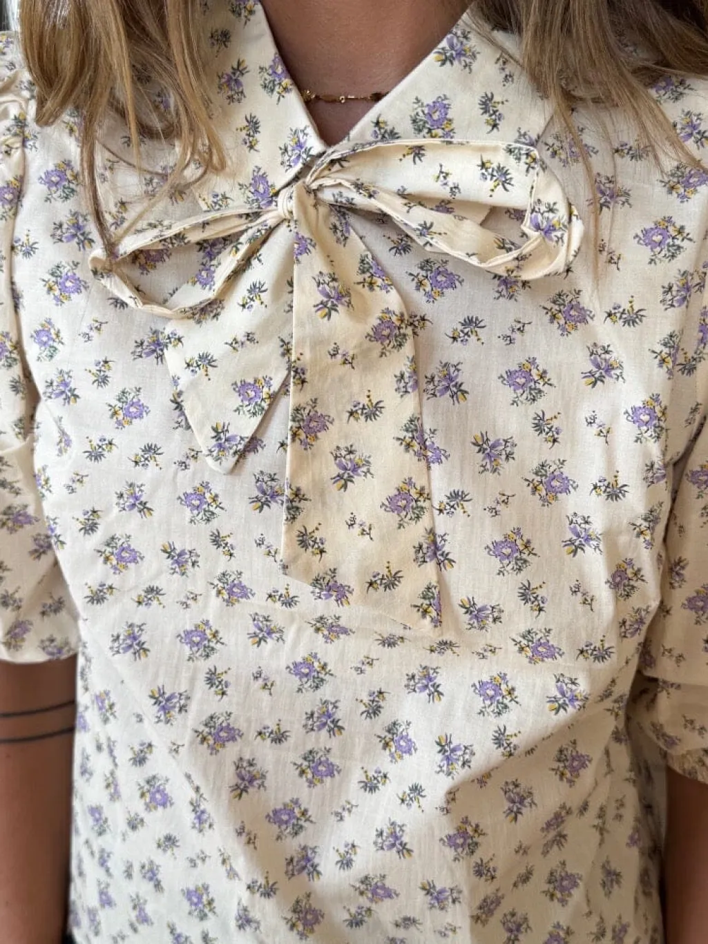 En gul bluse fra Dear Molly med blomsterprint i lilla nuancer. Blusen har en dekorativ sløjfe ved halsudskæringen og trekvartlange ærmer.