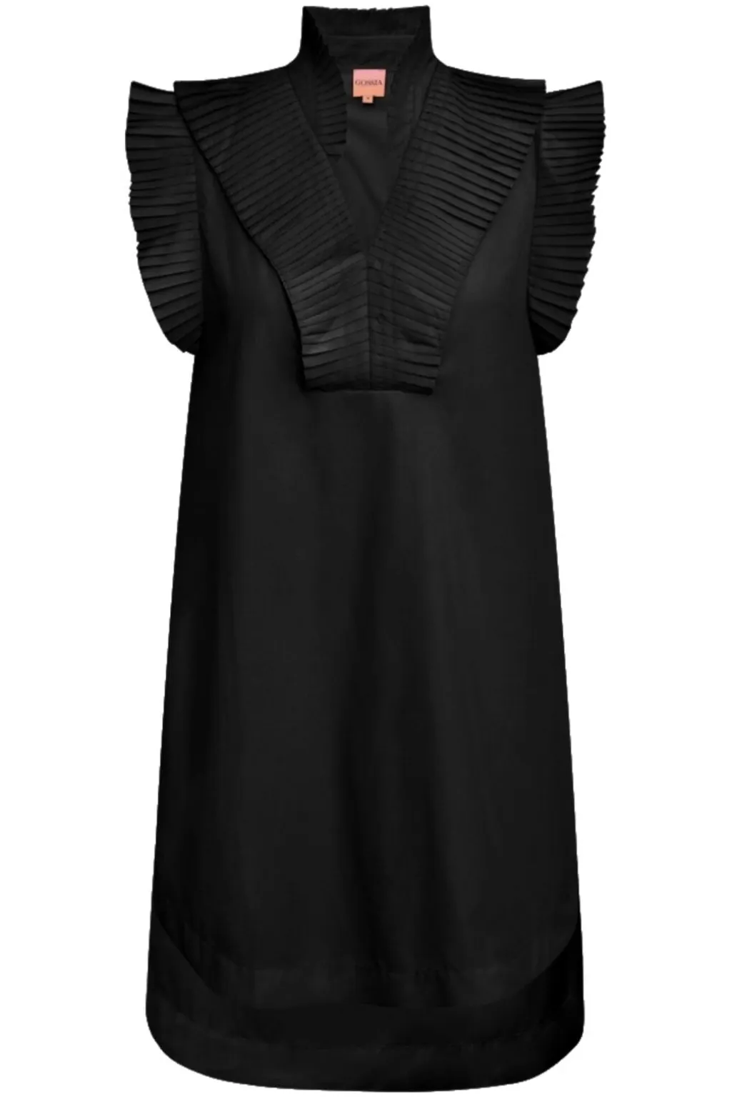 Sort kjole fra Gossia med plisserede detaljer på kraven og ærmerne. Den har en klassisk udformning med fokus på de fine folder, der giver kjolen sit særpræg.