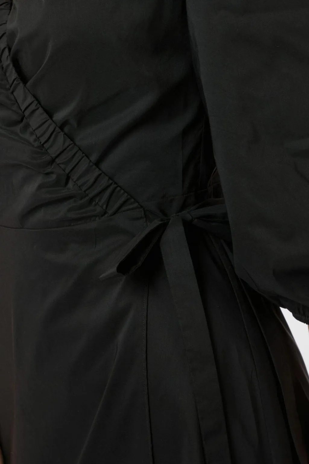 Sort poplin-kjole fra Neo Noir med slå-om-design og V-hals. Kjolen har rynkedetaljer ved udskæringen og et bindebånd i taljen.