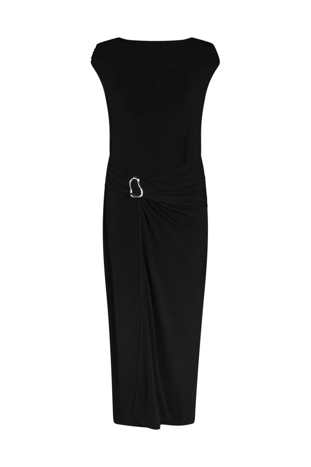 Sort kjole fra Neo Noir med drapering i taljen og sølvspænde. Kjolen har korte ærmer, rund hals og går til midt på læggen. Den slanke pasform følger kroppens linjer.
