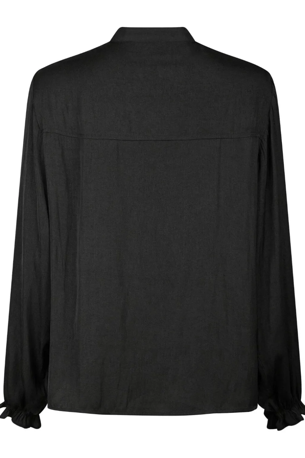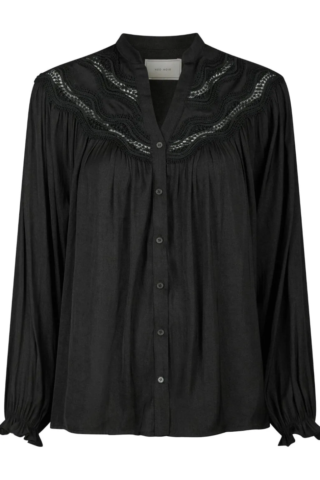 Sort bluse fra Neo Noir med blonde ved halsudskæringen. Blusen har V-udskæring, lange pufærmer og knaplukning foran.