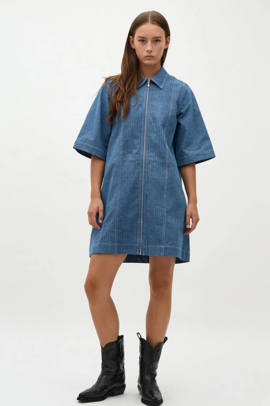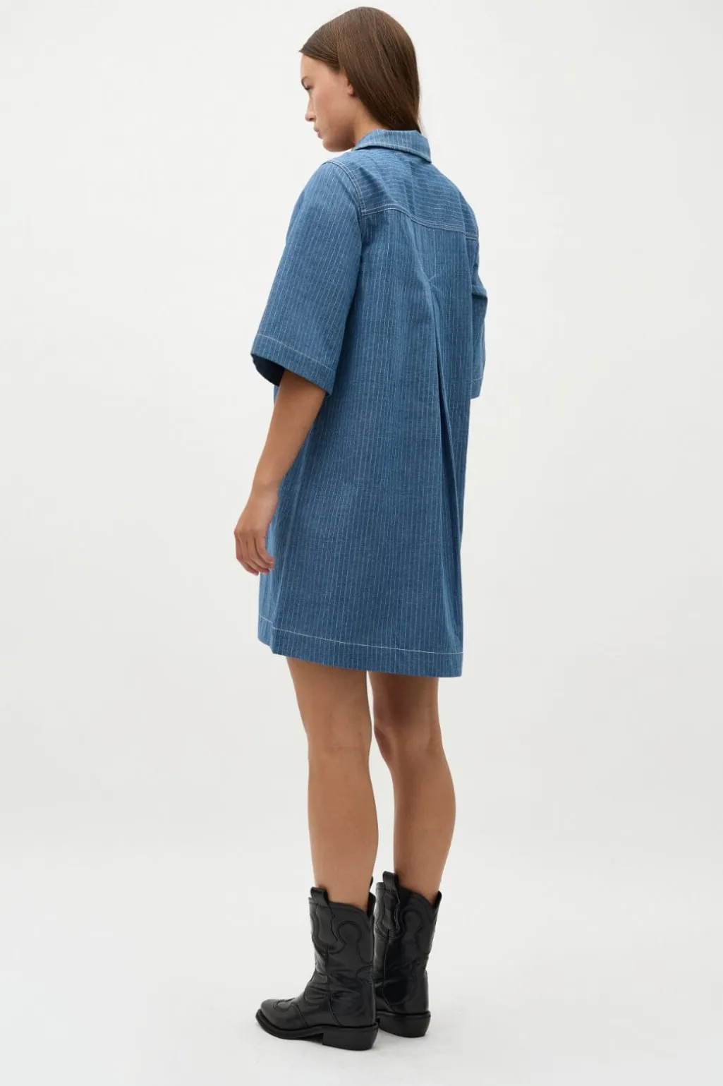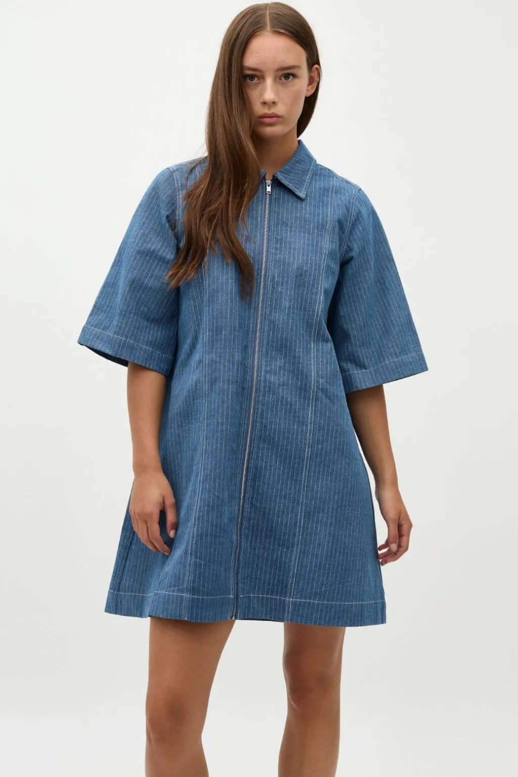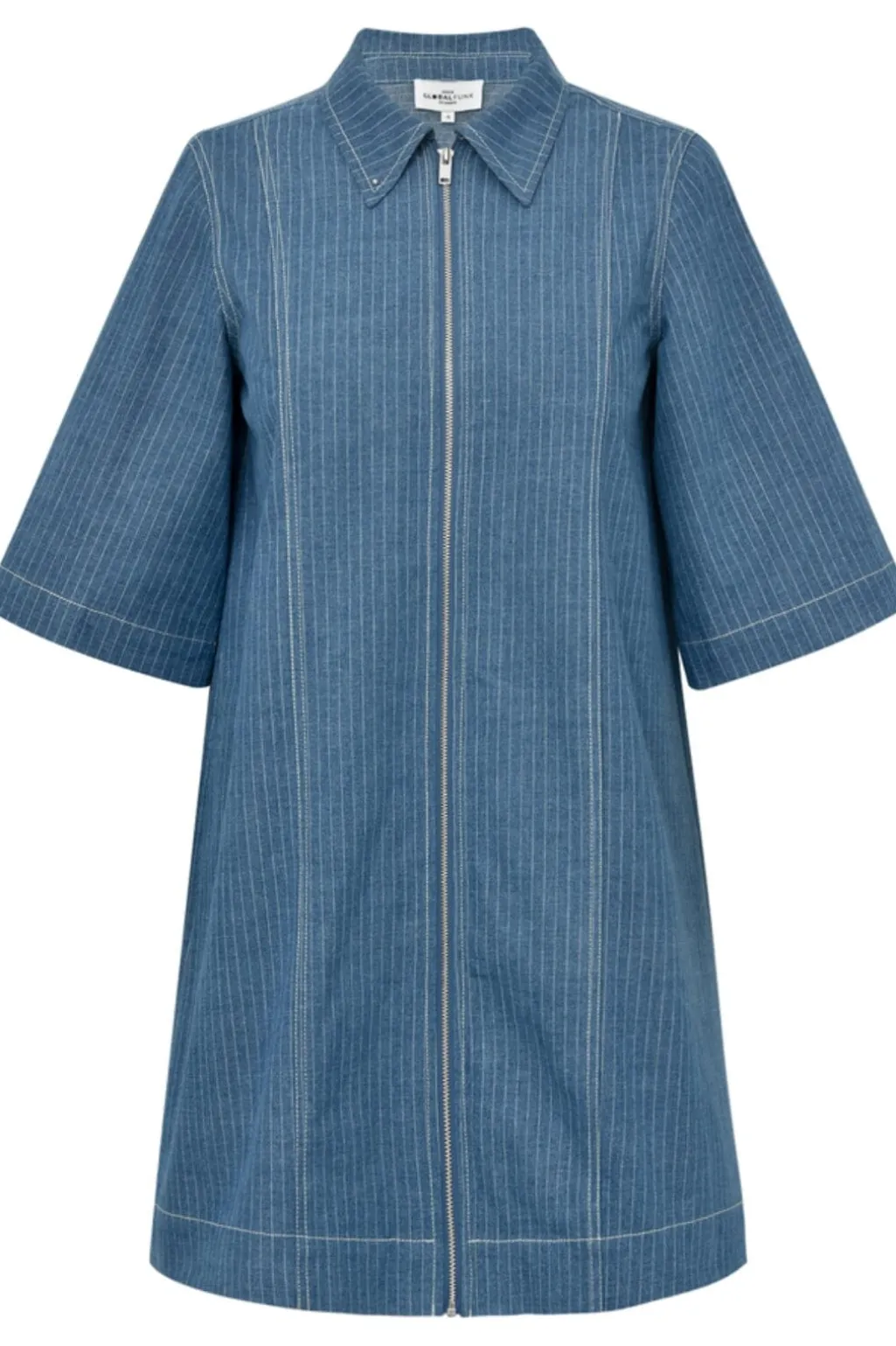 Blå kjole fra Global Funk med pinstriber. Kjolen har skjortekrave, korte ærmer og lynlås foran. Det blå stof har et klassisk stribemønster.
