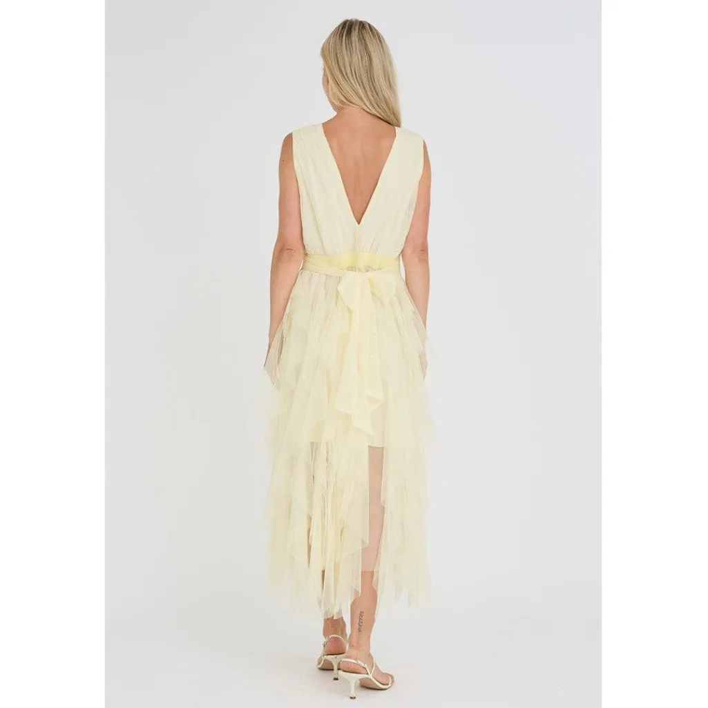 Ærmeløs kjole fra A-View i lys gul farve. Kjolen er lavet af 100% polyester og har en ankel-lang længde med lagdelt nederdel.