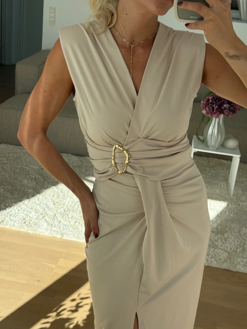 Beige kjole fra A-bee med V-udskæring og dekorativ spænde ved taljen. Kjolen er lavet til bryllupper, fejringer og formelle begivenheder.
