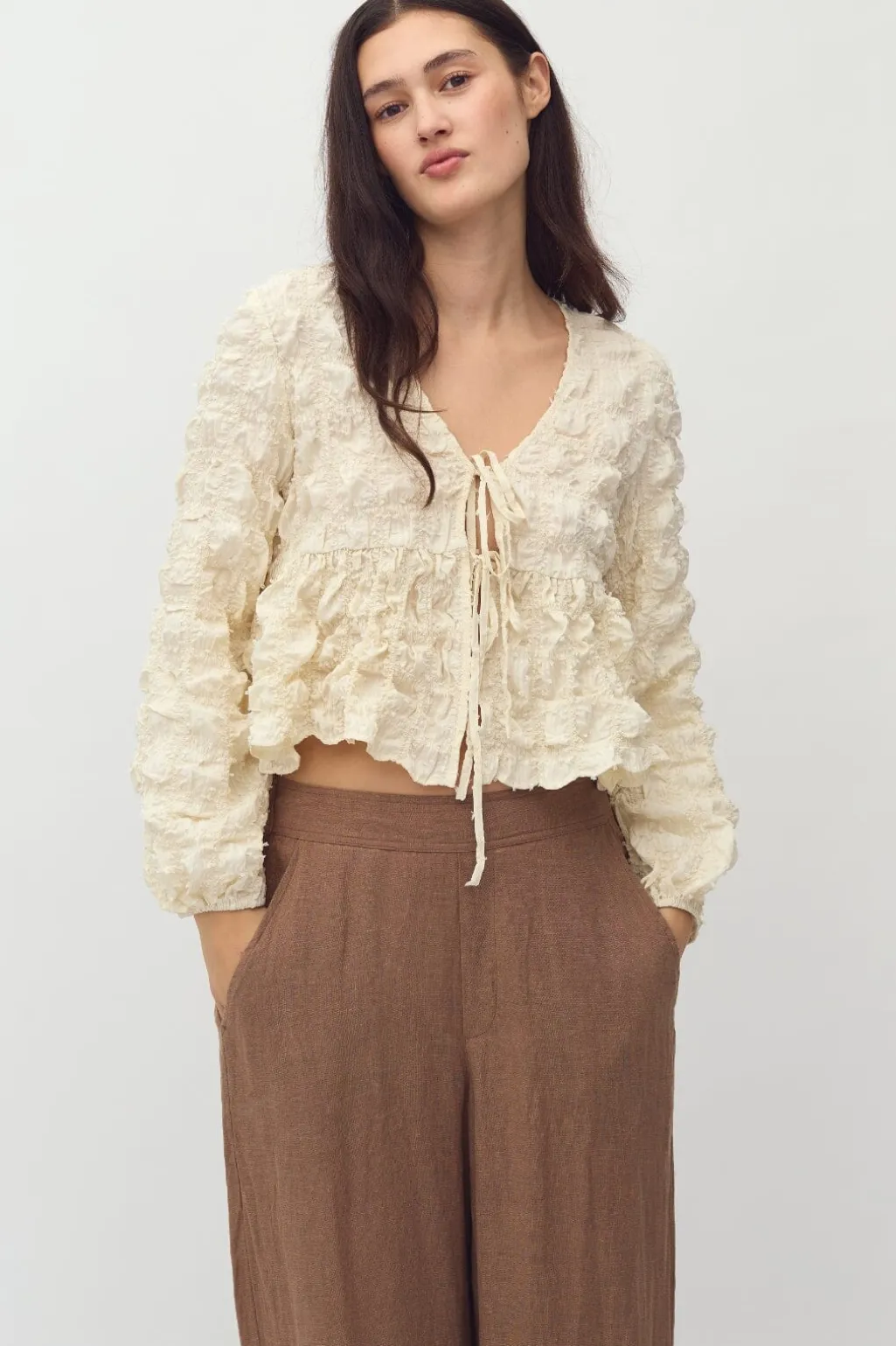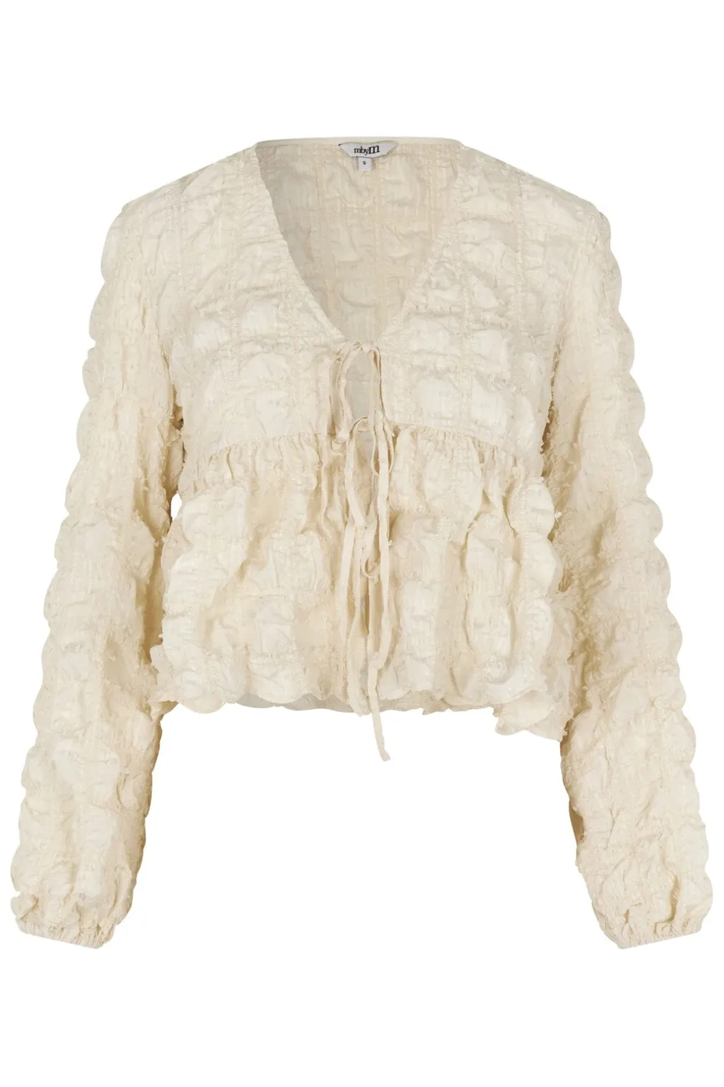 Bluse fra MbyM i en cremehvid oyster-nuance. Den har rynkedetaljer over det hele og bindebånd ved V-udskæringen. De lange ærmer har flæser, der giver blusen struktur.