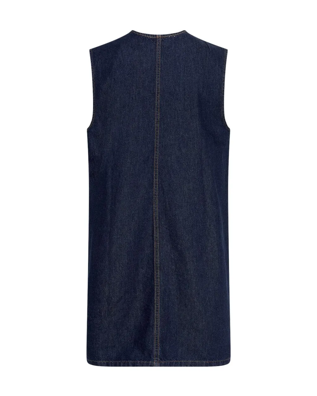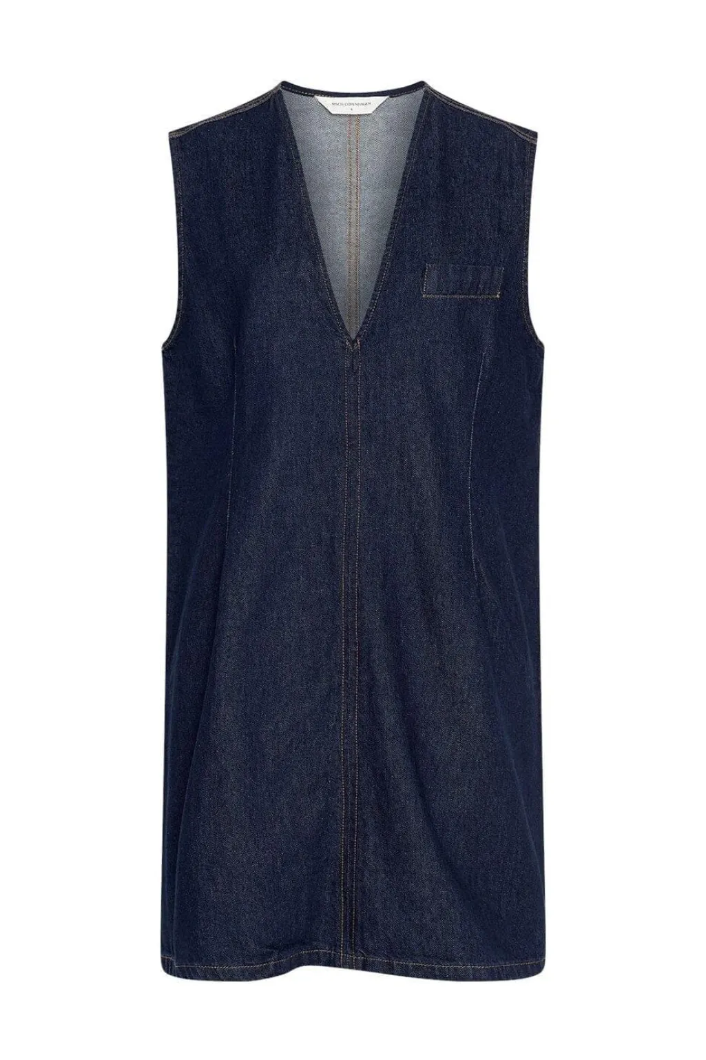 En ærmeløs denimkjole fra Moss Copenhagen i mørkeblå vask. Kjolen har en dyb V-udskæring og en løs pasform med dekorative syninger.