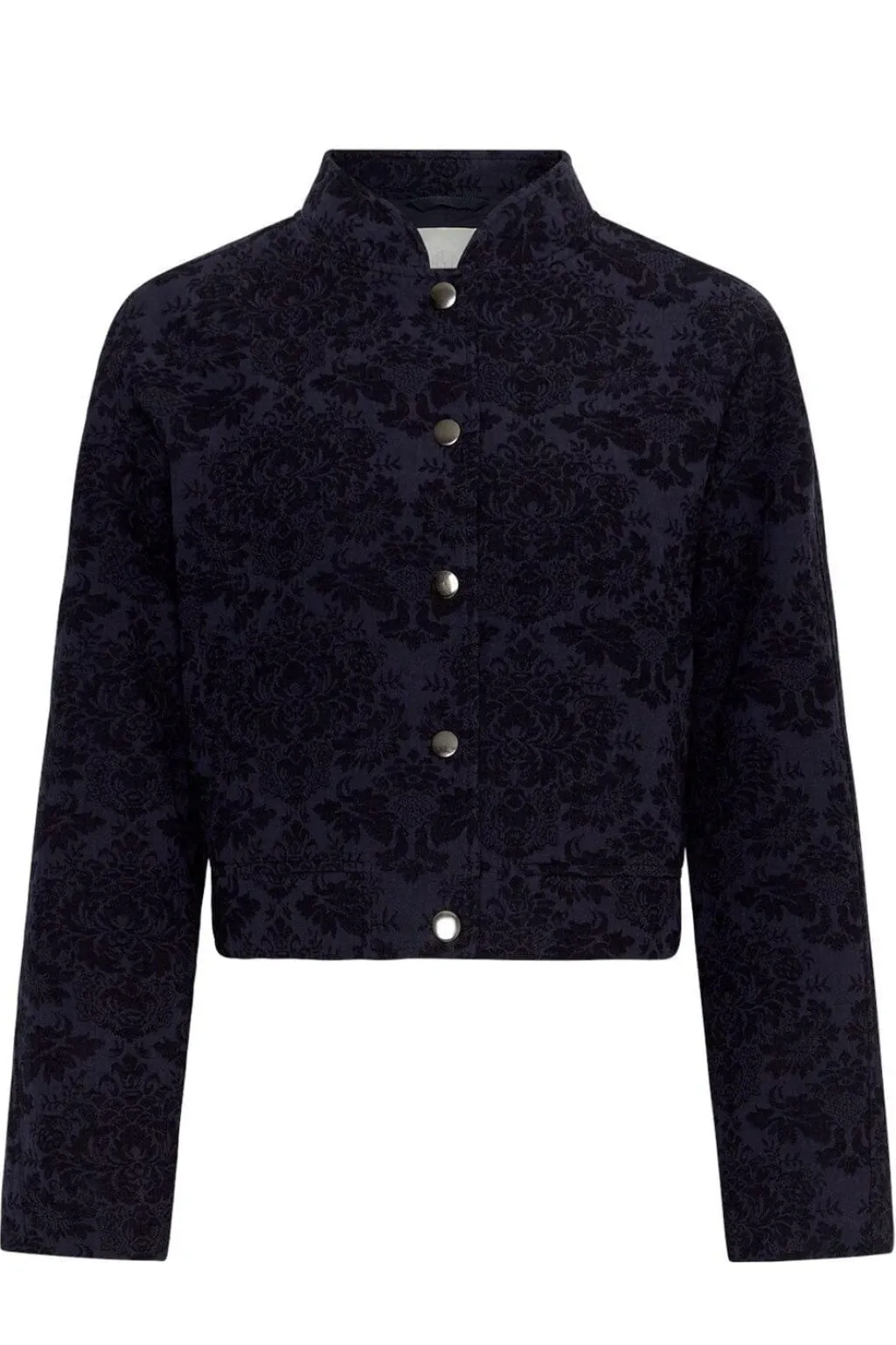 Jakke fra Moss Copenhagen i en mørkeblå nuance med et floralt mønster over hele stoffet. Jakken har lange ærmer og en stående krave.
