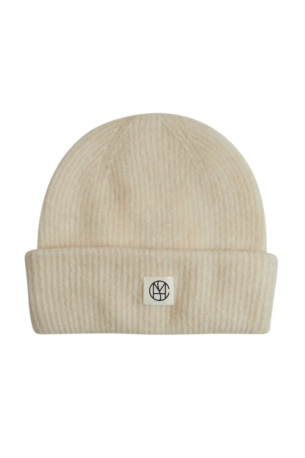 En beanie fra Moss Copenhagen i lys beige. Den foldede kant giver en klassisk beanie-stil med et lille rektangulært logo på forsiden.