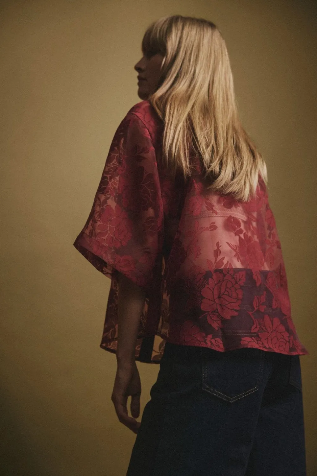 En skjorte fra MSCH Copenhagen i bordeaux nuance med floralt mønster. Lavet af 100 % polyester med broderede detaljer og en løs pasform.