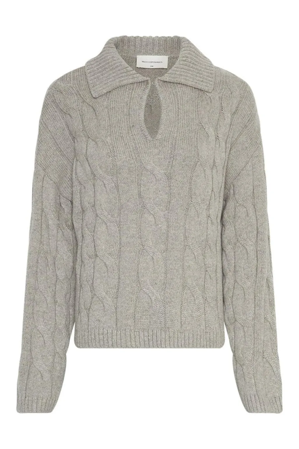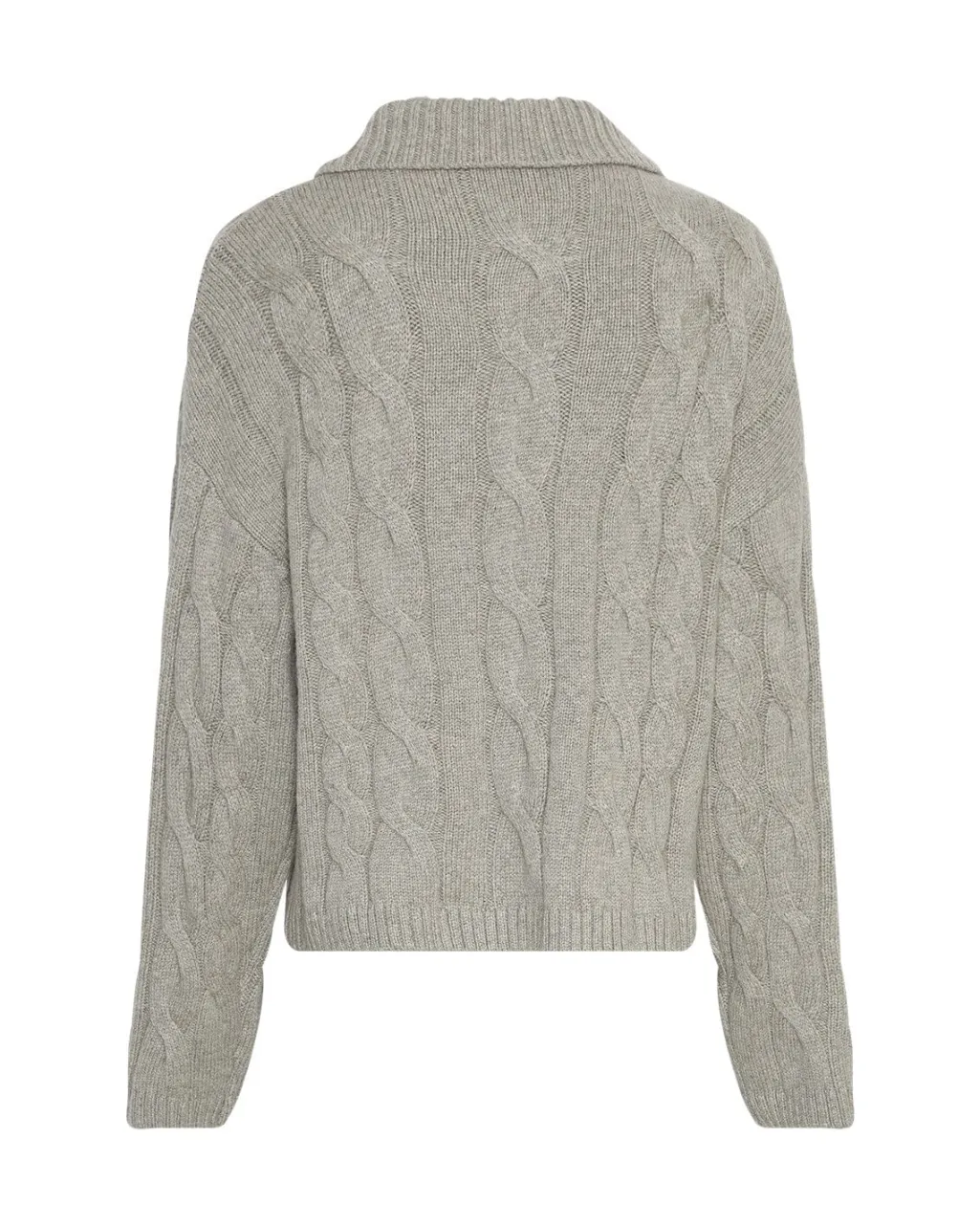 Lys grå pullover fra Moss Copenhagen med kabelstrikmønster. Pulloveren har en polokrave med en lille åbning ved halsen.
