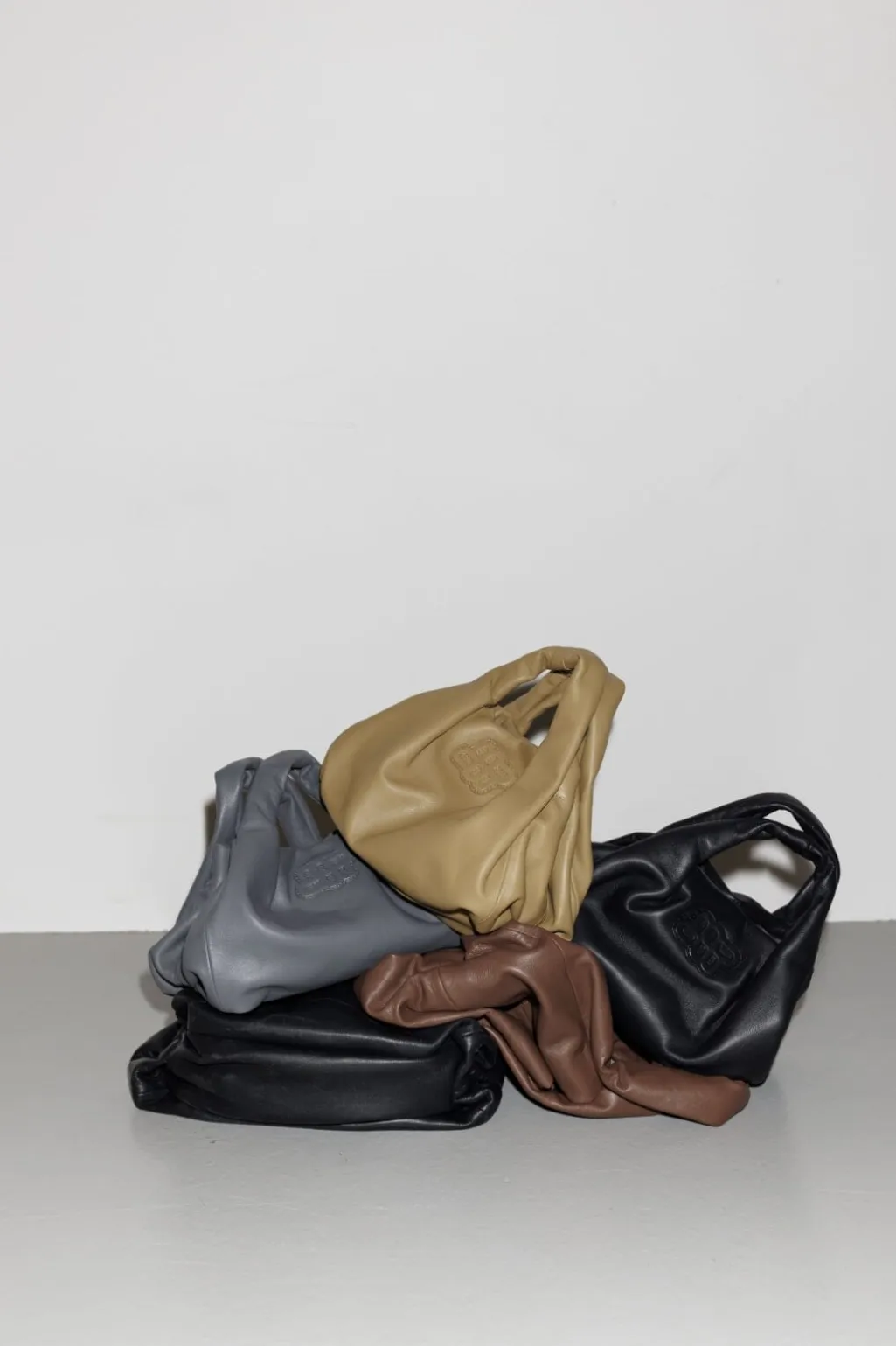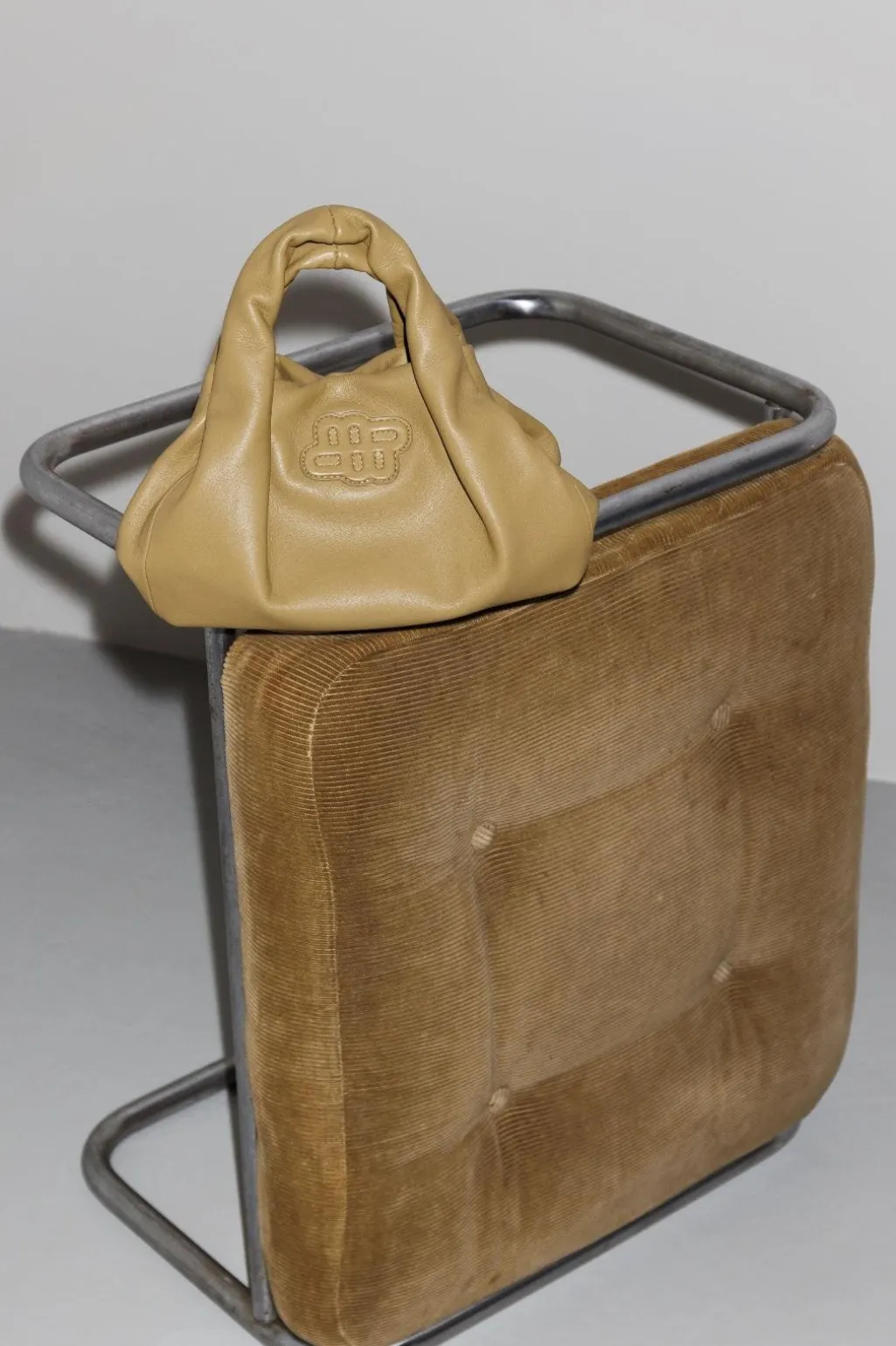 Gylden håndtaske fra Munthe i blødt lammeskind. Tasken har en afrundet form med kort hank og et indgraveret logo på forsiden. En aftagelig skulderrem giver flere bæremuligheder.
