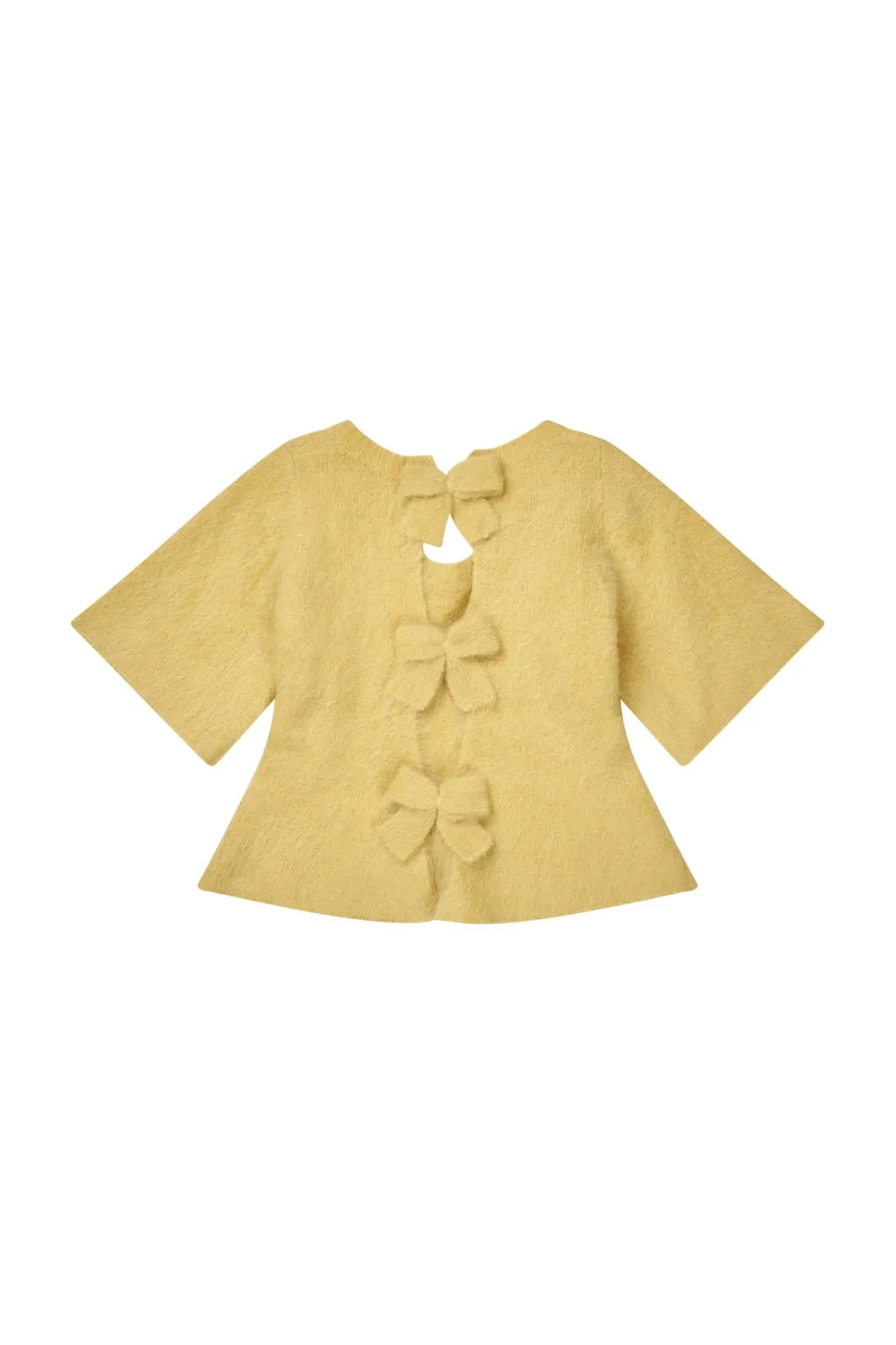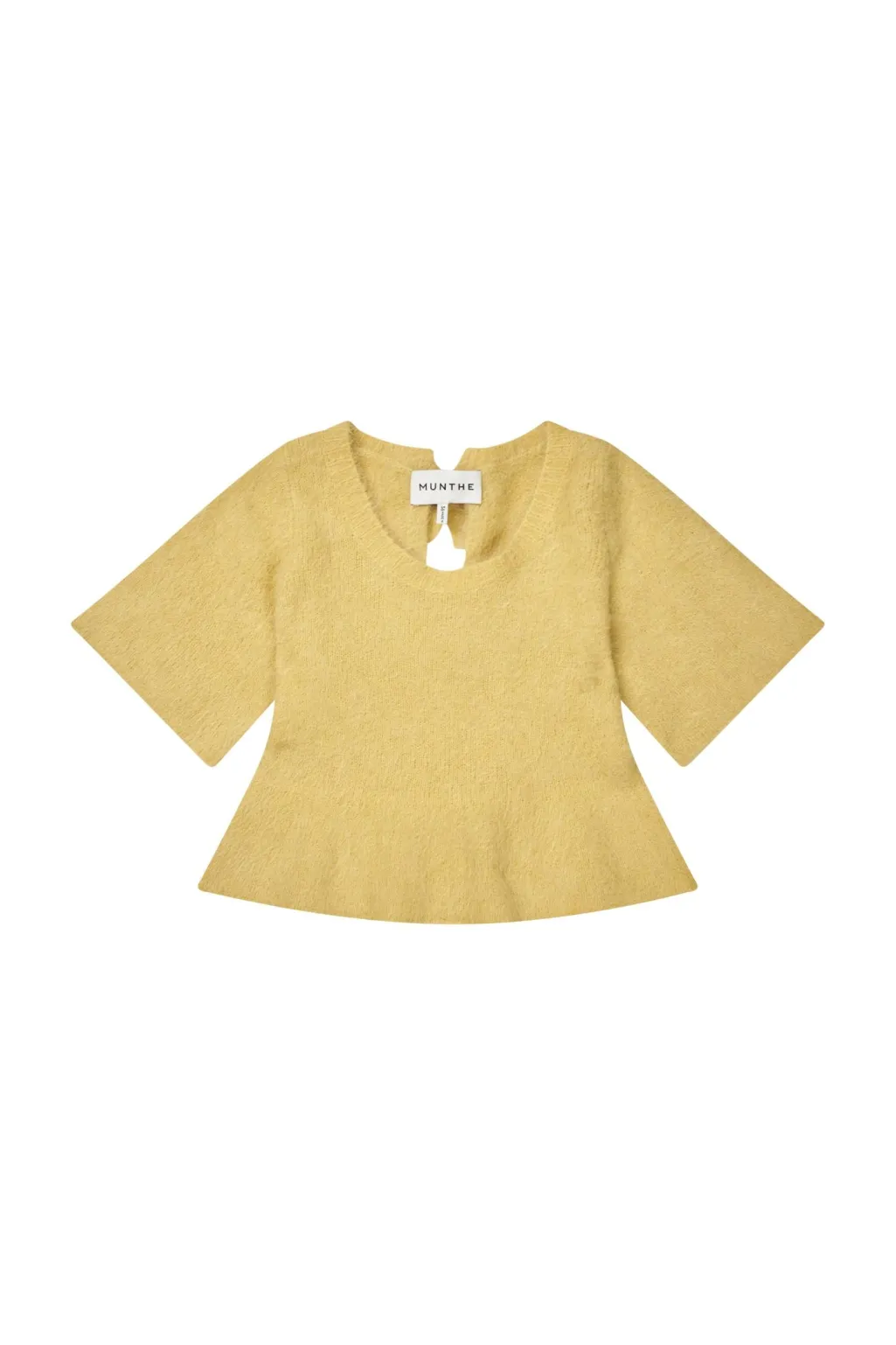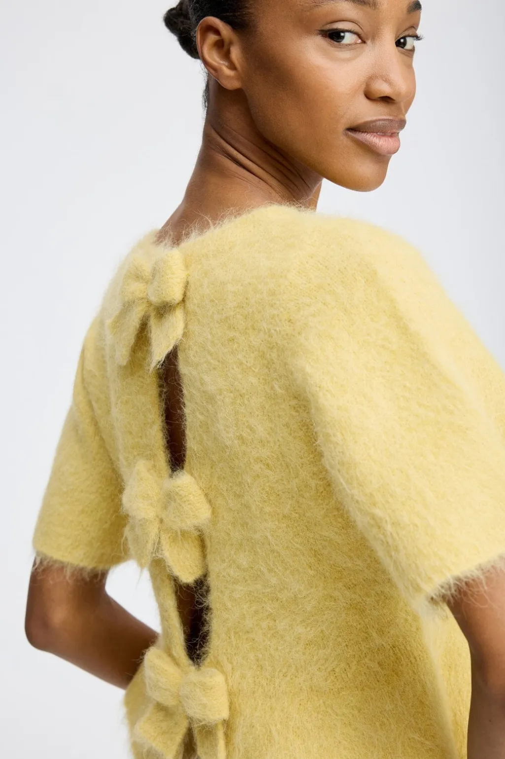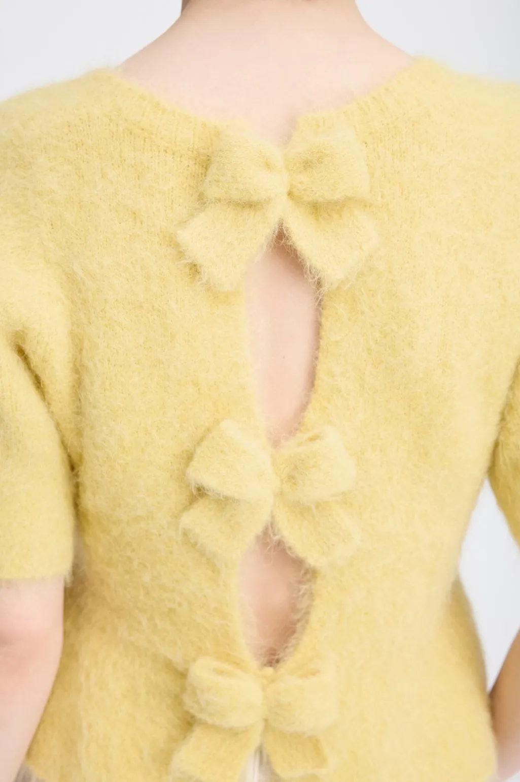 Gul strikbluse fra Munthe med kort ærme og rund hals. Strikken har en tætsiddende pasform, tre dekorative sløjfer på ryggen samt en peplum-effekt forneden.