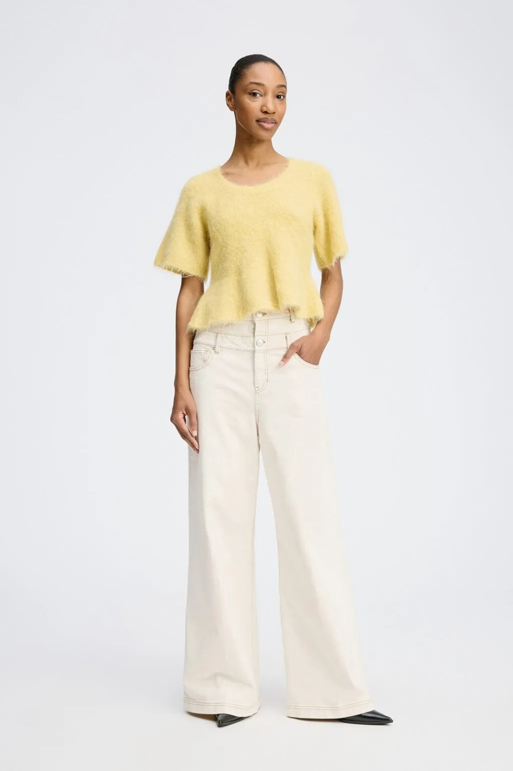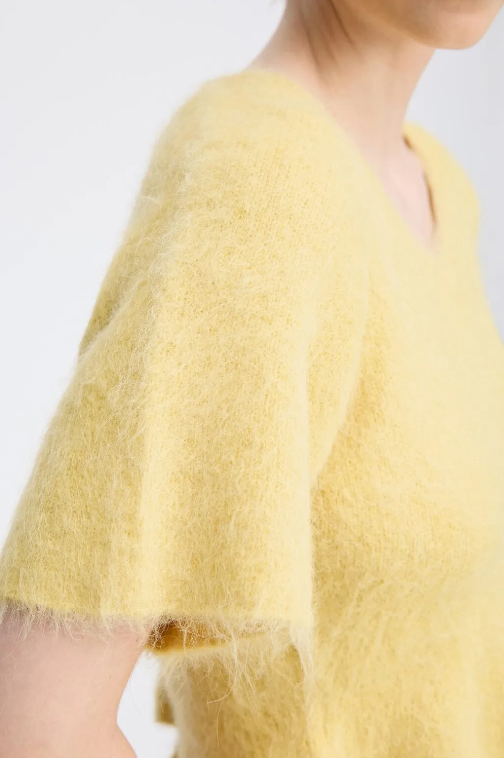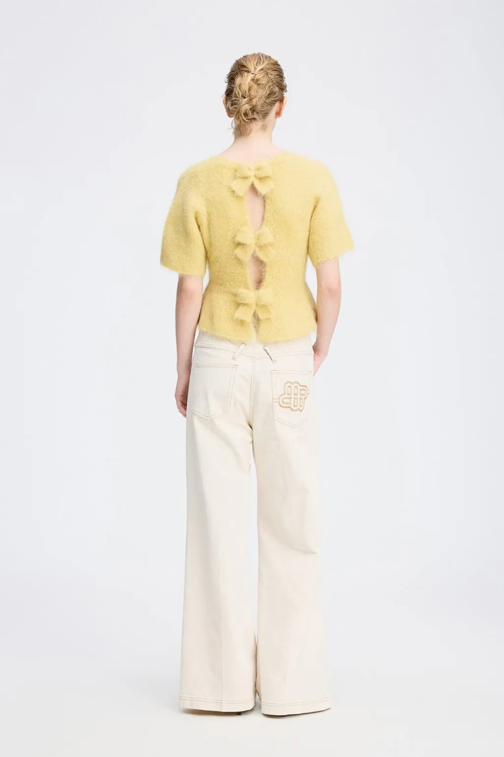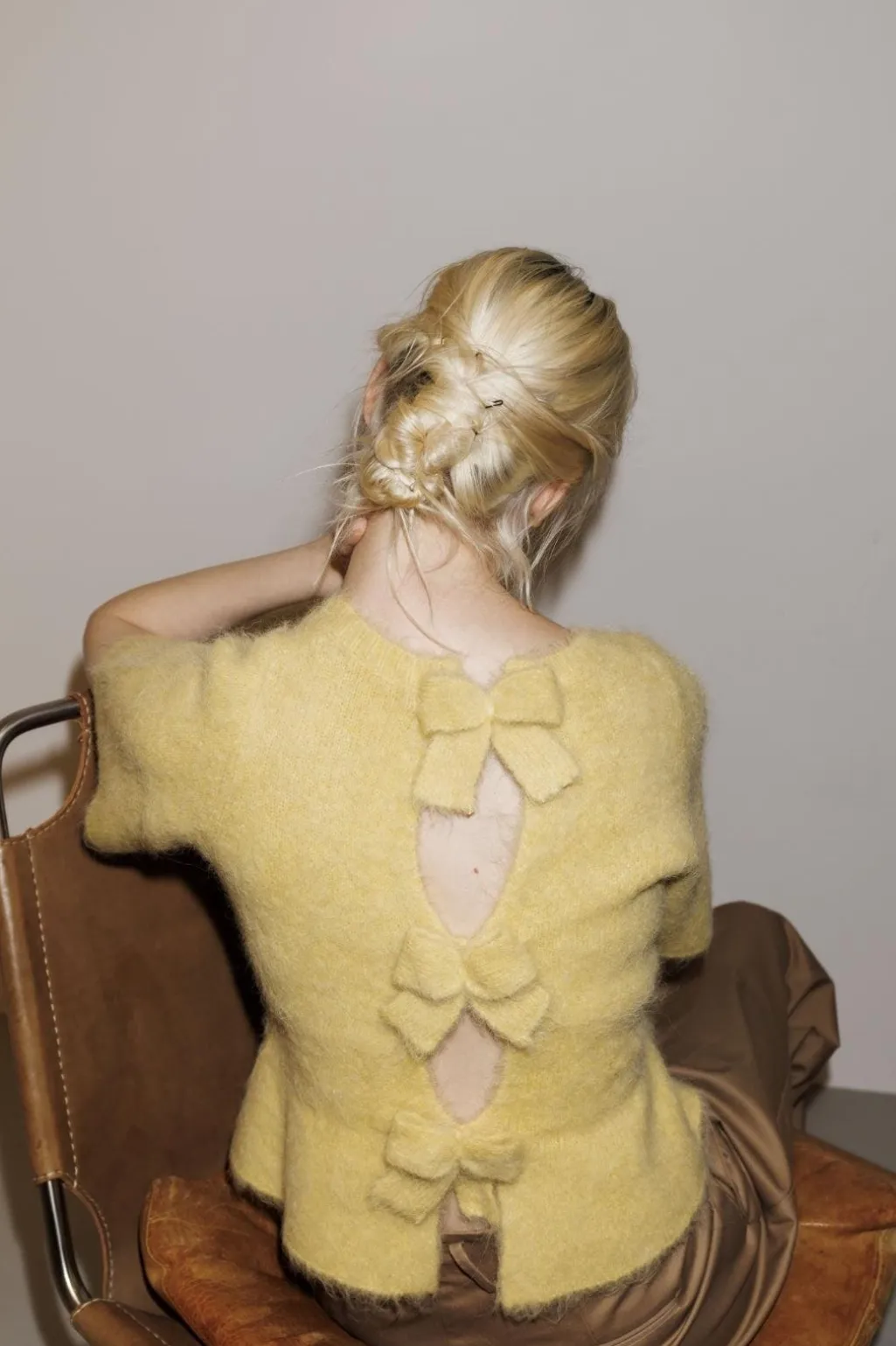 Gul strikbluse fra Munthe med kort ærme og rund hals. Strikken har en tætsiddende pasform, tre dekorative sløjfer på ryggen samt en peplum-effekt forneden.