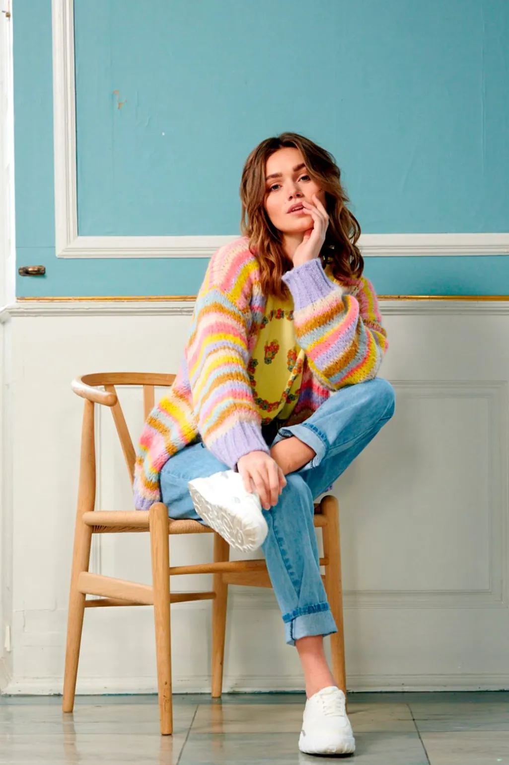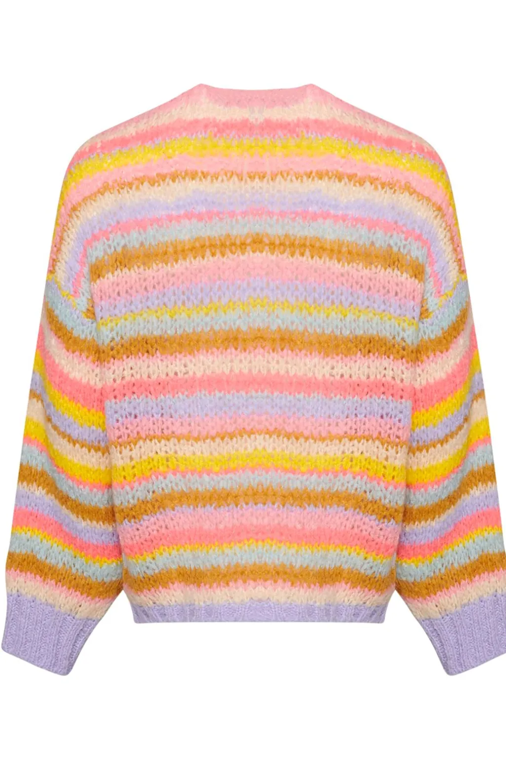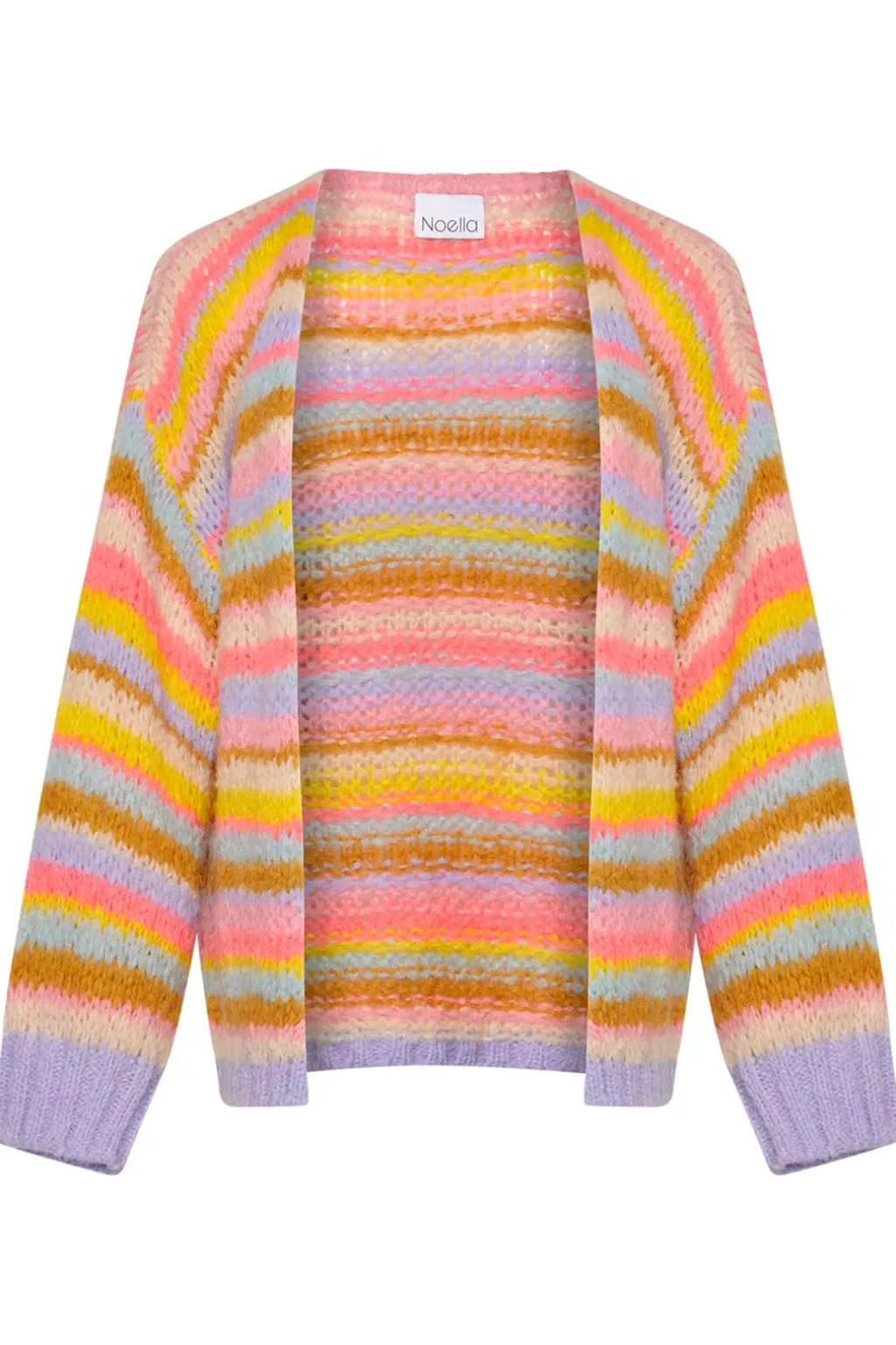 Strikket cardigan fra Noella med vandrette striber i lyse pastelnuancer. De bløde farver går fra lyserød og gul til lyseblå, og cardiganen har en åben front uden lukning.