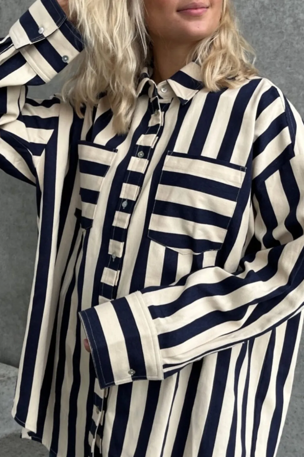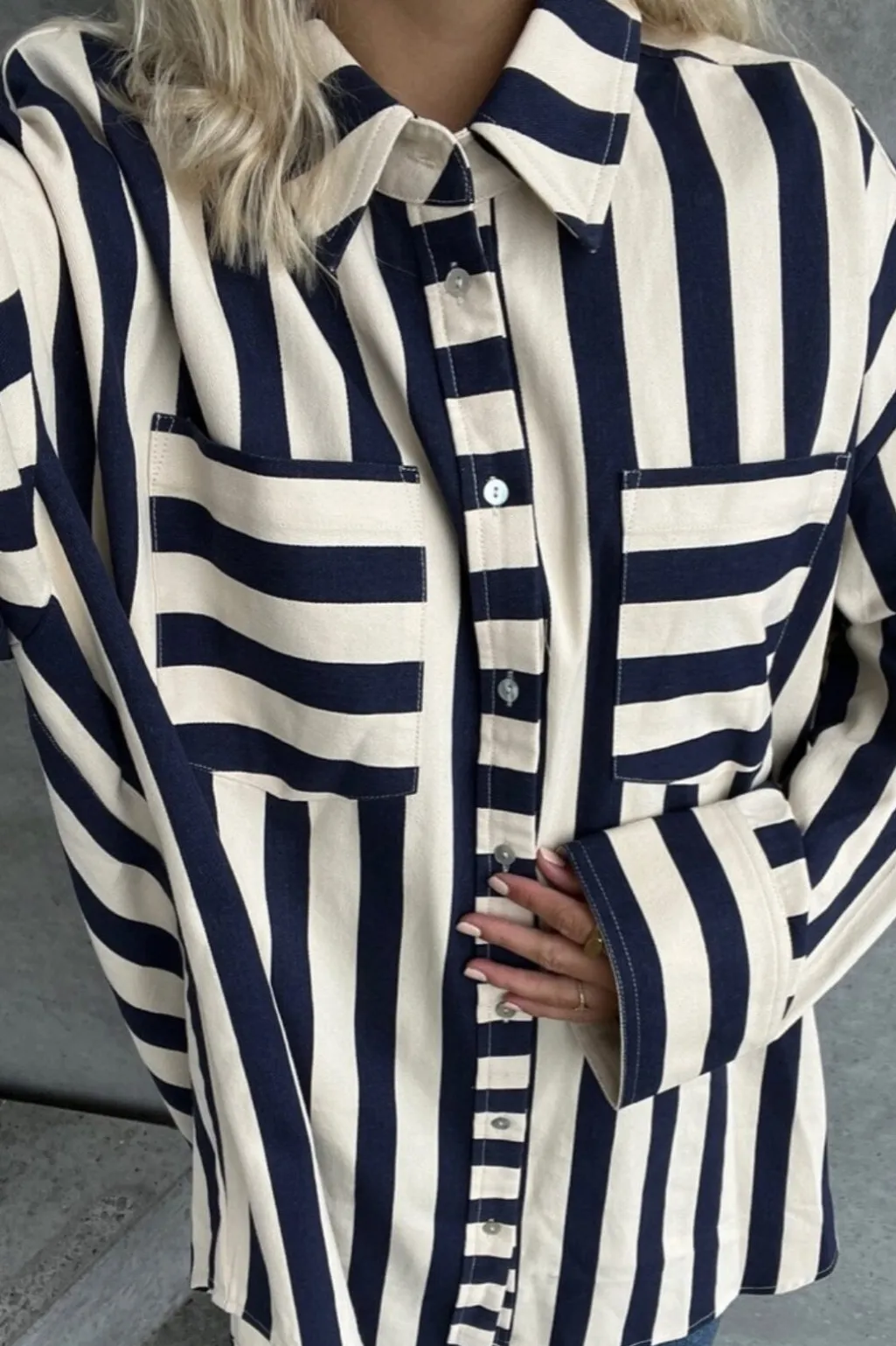 Stribet skjorte fra Stories From The Atelier by Copenhagen Shoes med blå og beige striber. Den har skjortekrave, to frontlommer og lange ærmer.