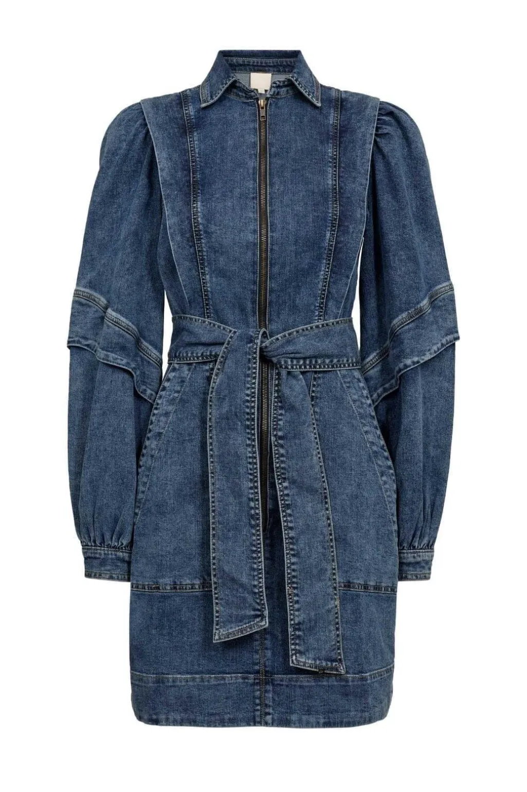 Denimkjole fra Gossia i mellemblå denim. Kjolen har skjortekrave, lange ærmer og går til låret. Den har dekorative syninger og et bindebælte.