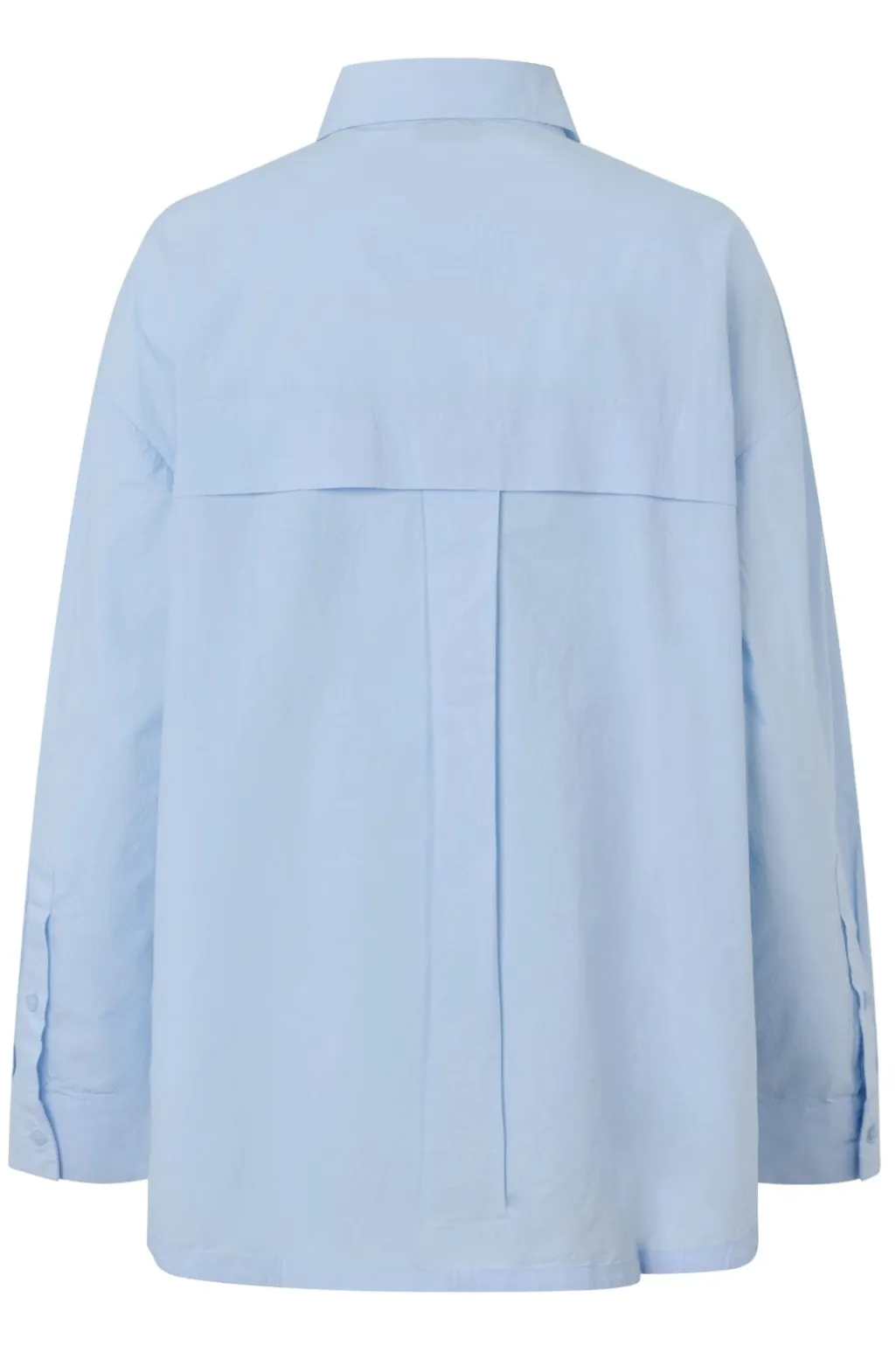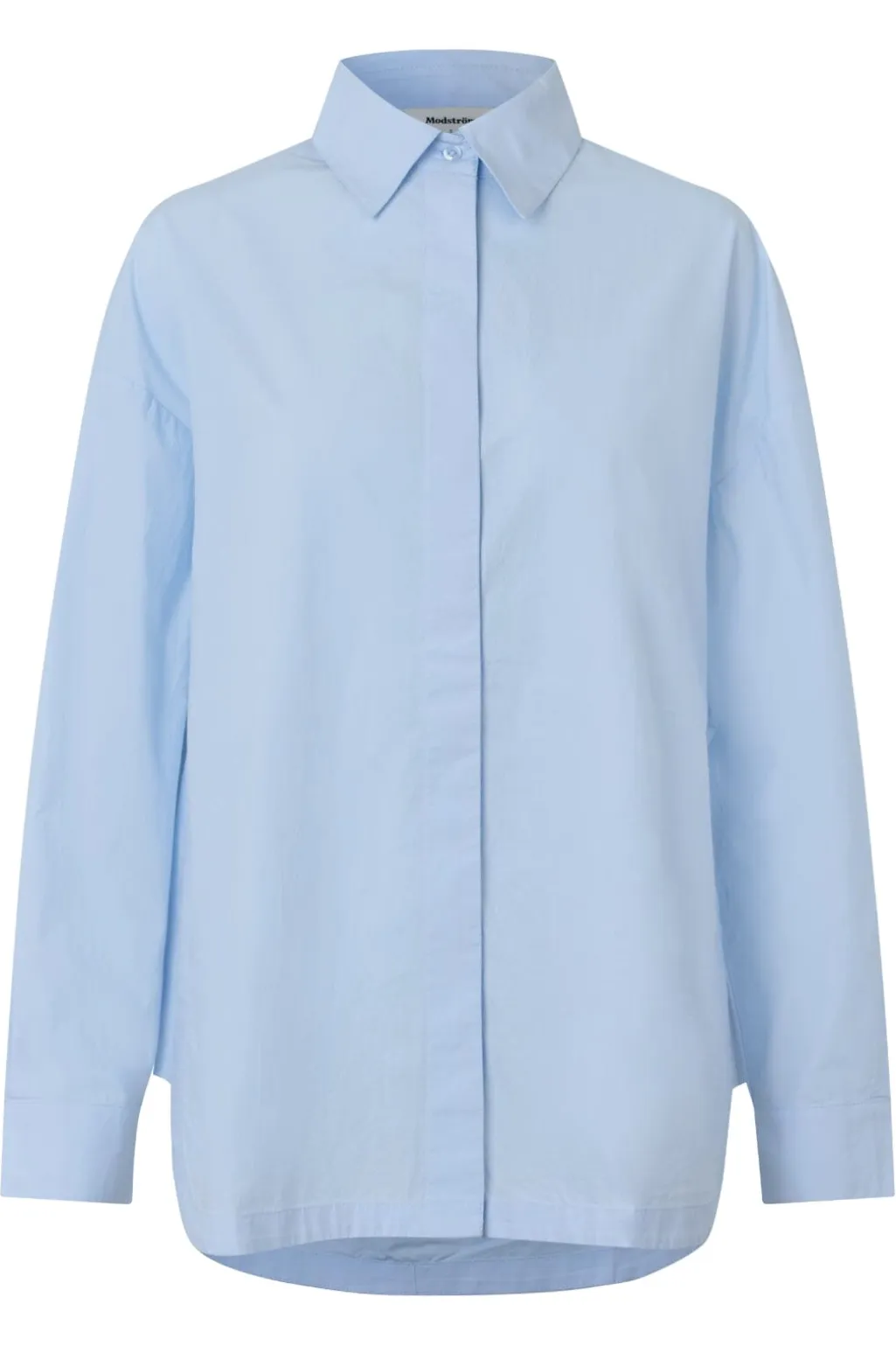 Lyseblå skjorte fra Modström i en oversized pasform. Den skjulte knaplukning og slidsen i siden giver skjorten et rent og enkelt udtryk.