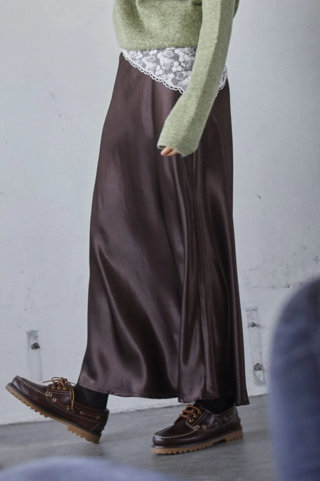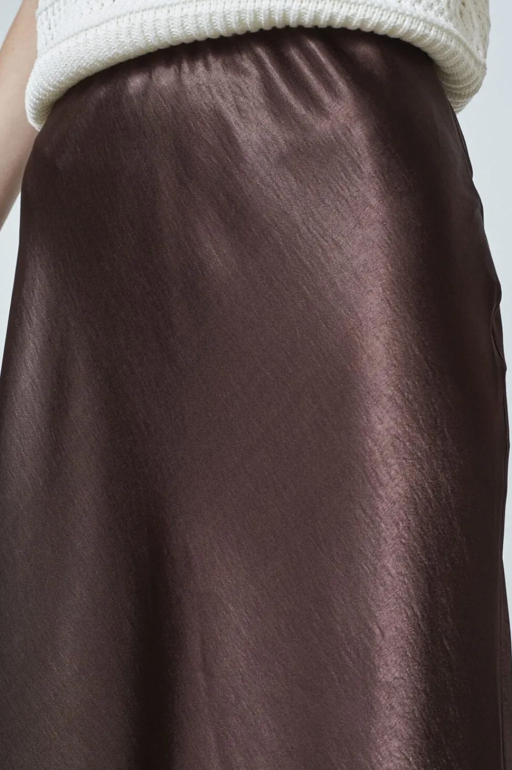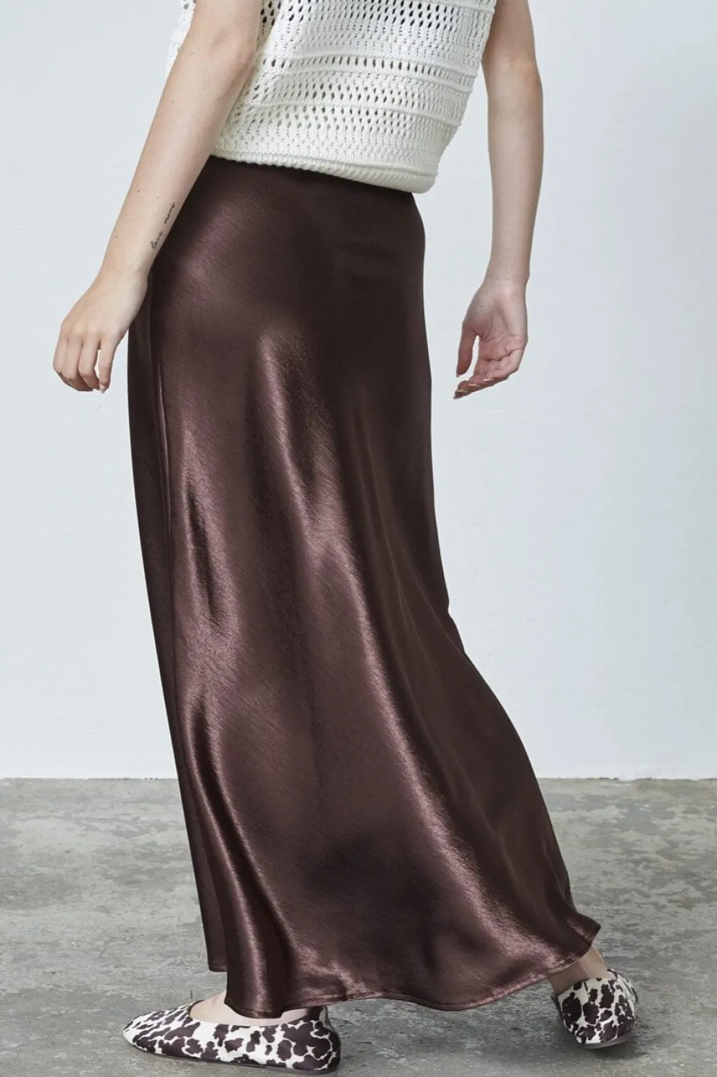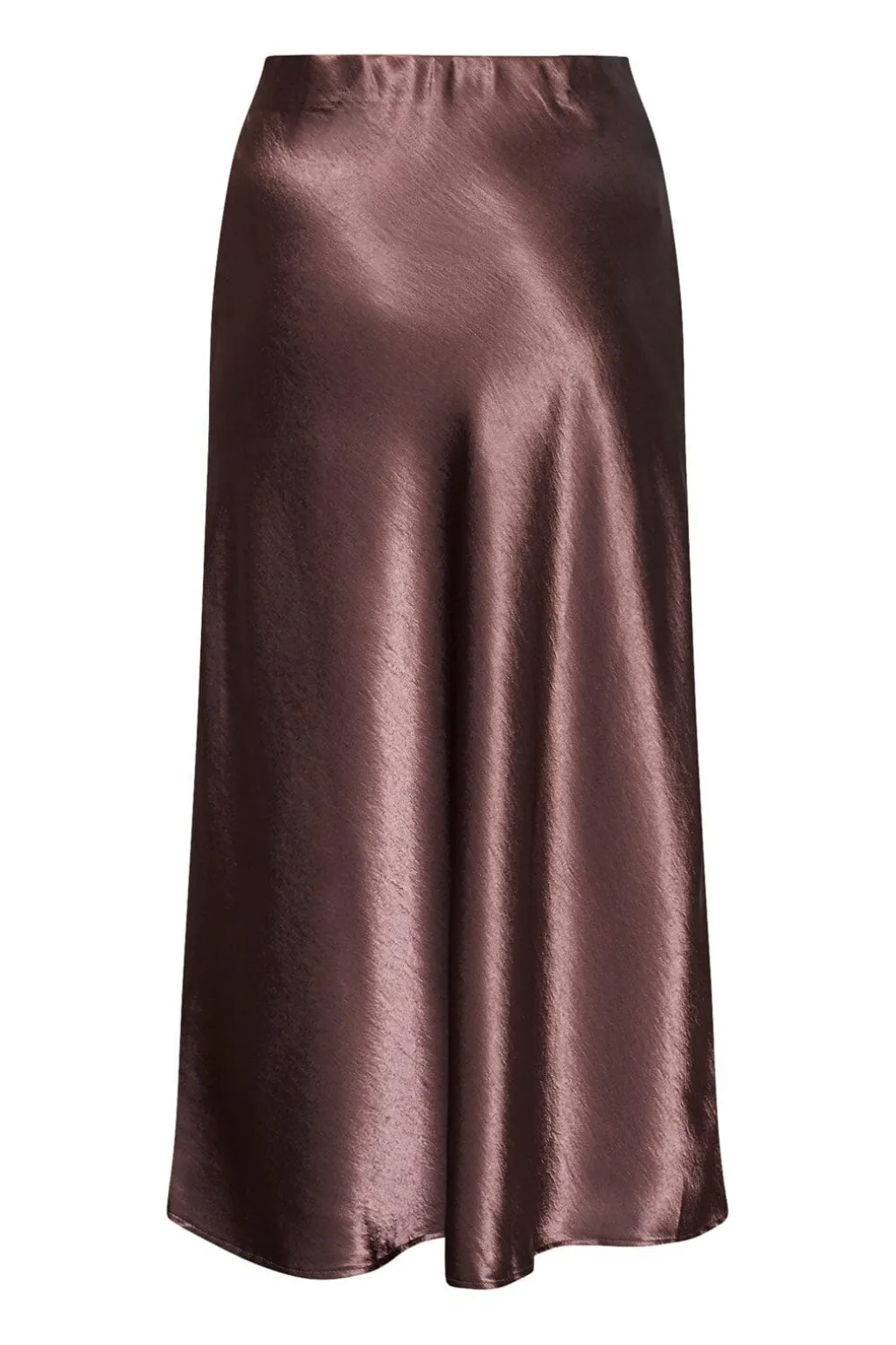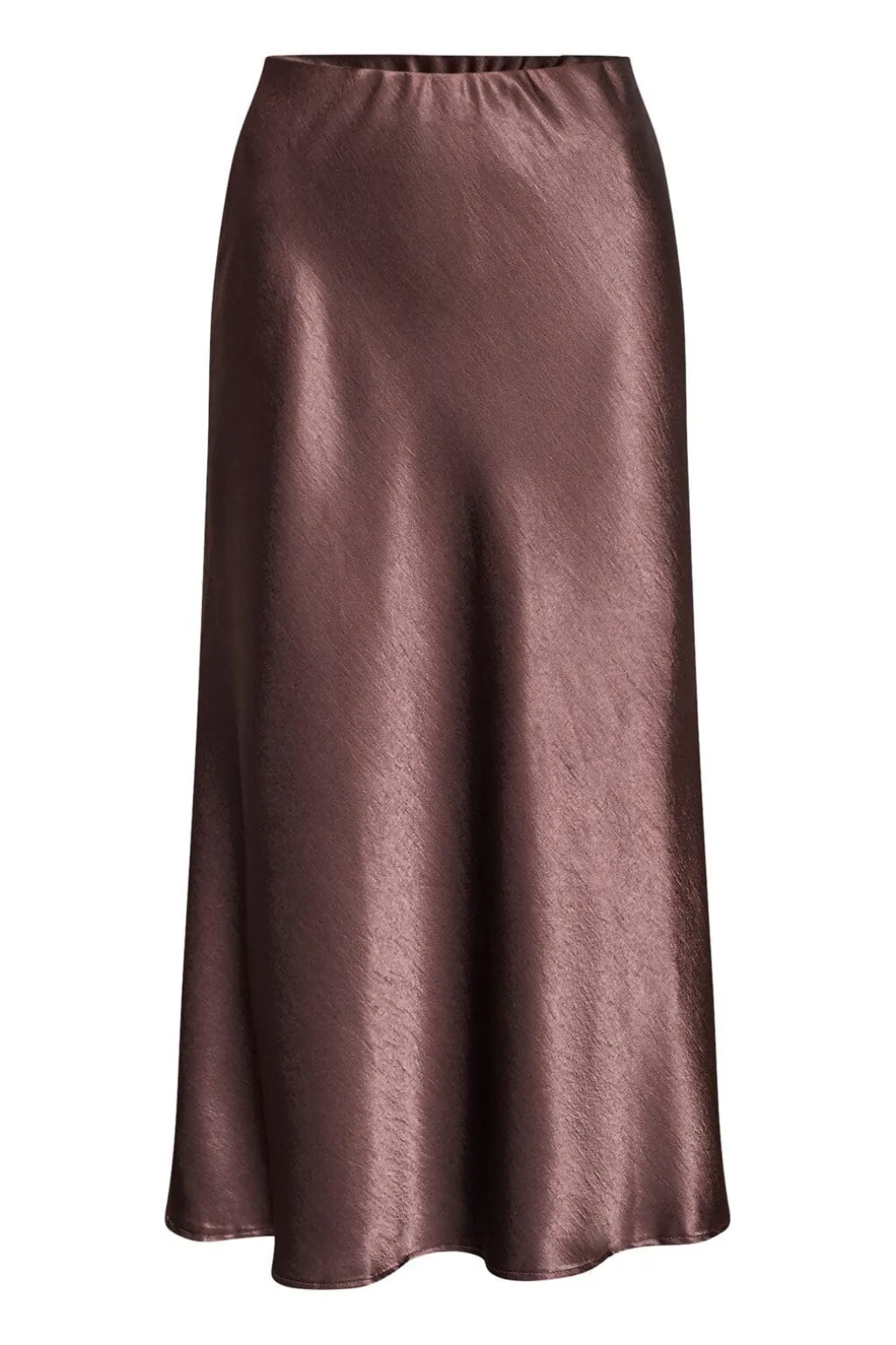 Brun nederdel fra Sisters Point i skinnende satinmateriale. A-line faconen og det glatte stof giver nederdelen et blødt fald. Længden går til læggen.