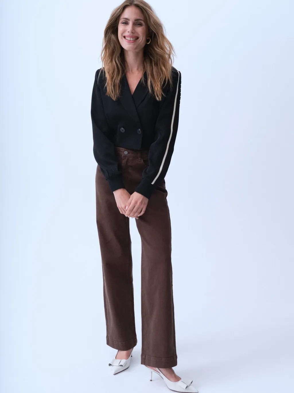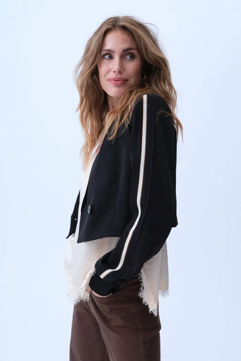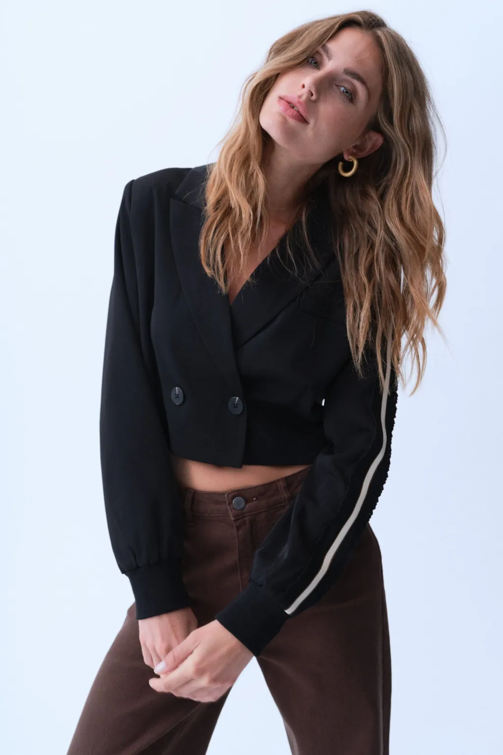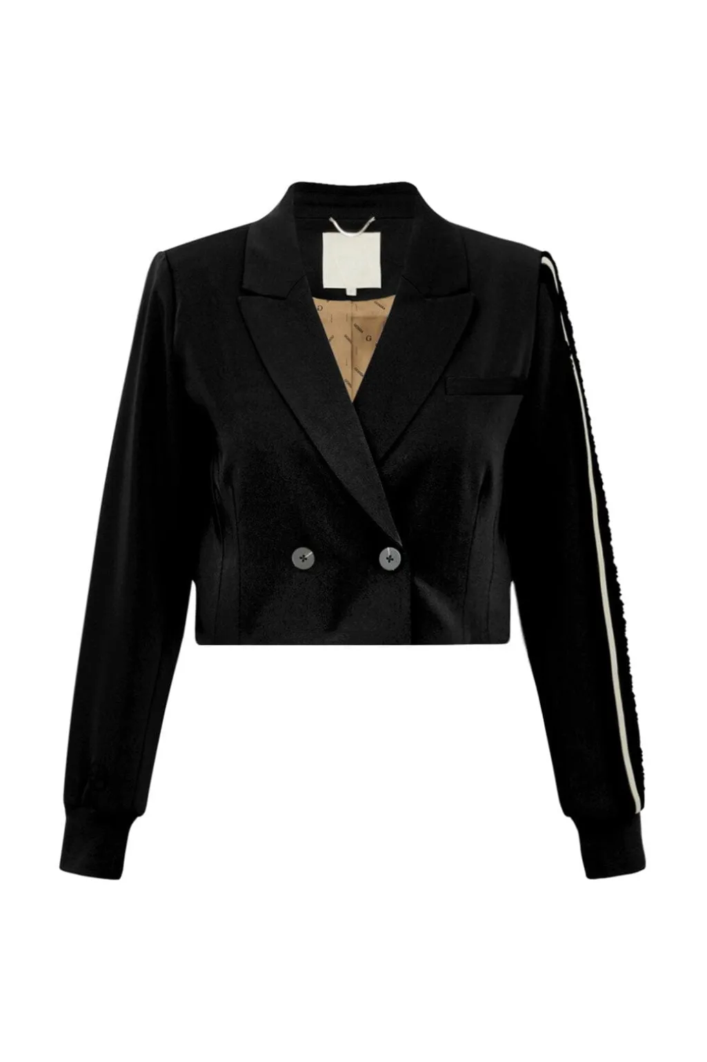 Sort blazer fra Gossia med kort design og dobbeltknaplukning. Blazeren har lange ærmer med kontrasterende striber langs siden og en brystlomme på venstre side. V-udskæringen giver et feminint præg.