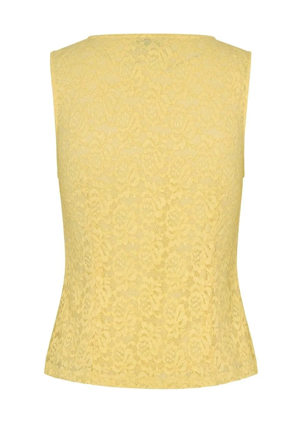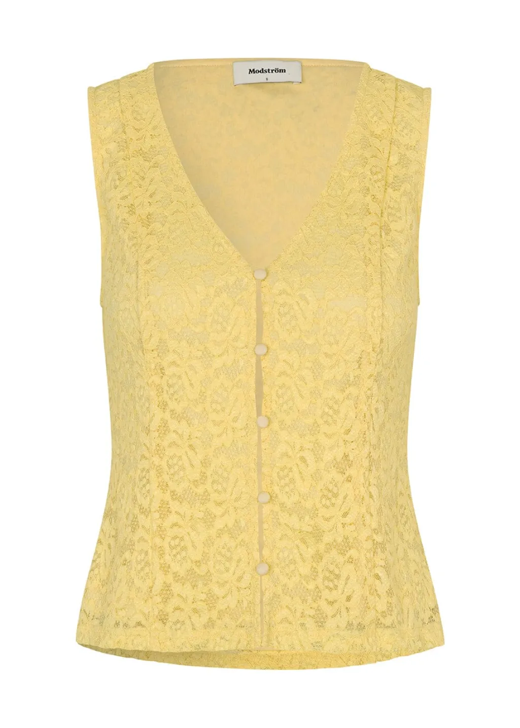 Gul top fra Modström med blondedetaljer og v-udskæring. Toppen har knaplukning foran og indvendigt foer, der giver et pænt fald.
