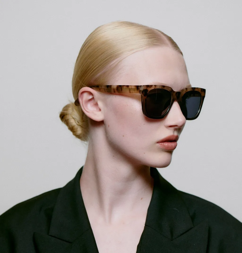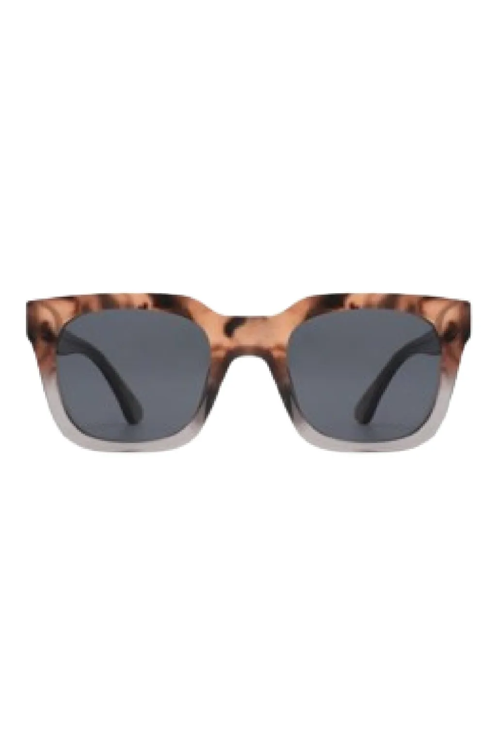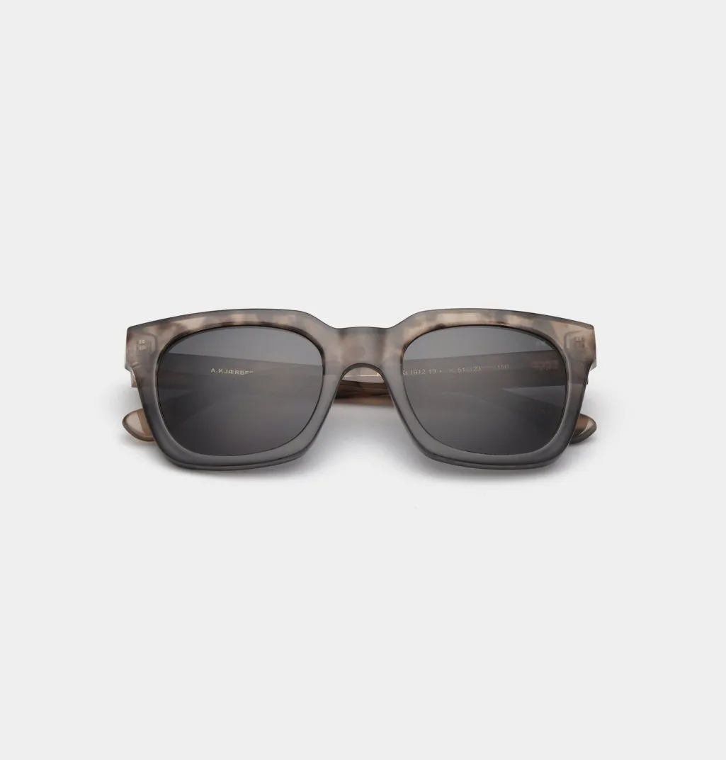 Firkantede solbriller fra A. Kjærbede med skildpaddemønstret stel i brun og grå transparent. Stellet har UV400-beskyttede polycarbonatlinser og justerbare stænger med metalkerne.