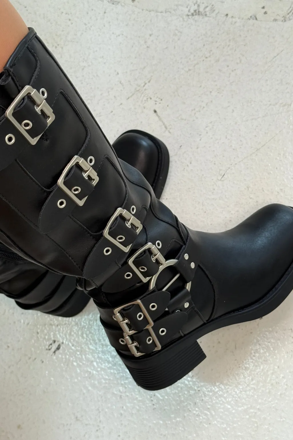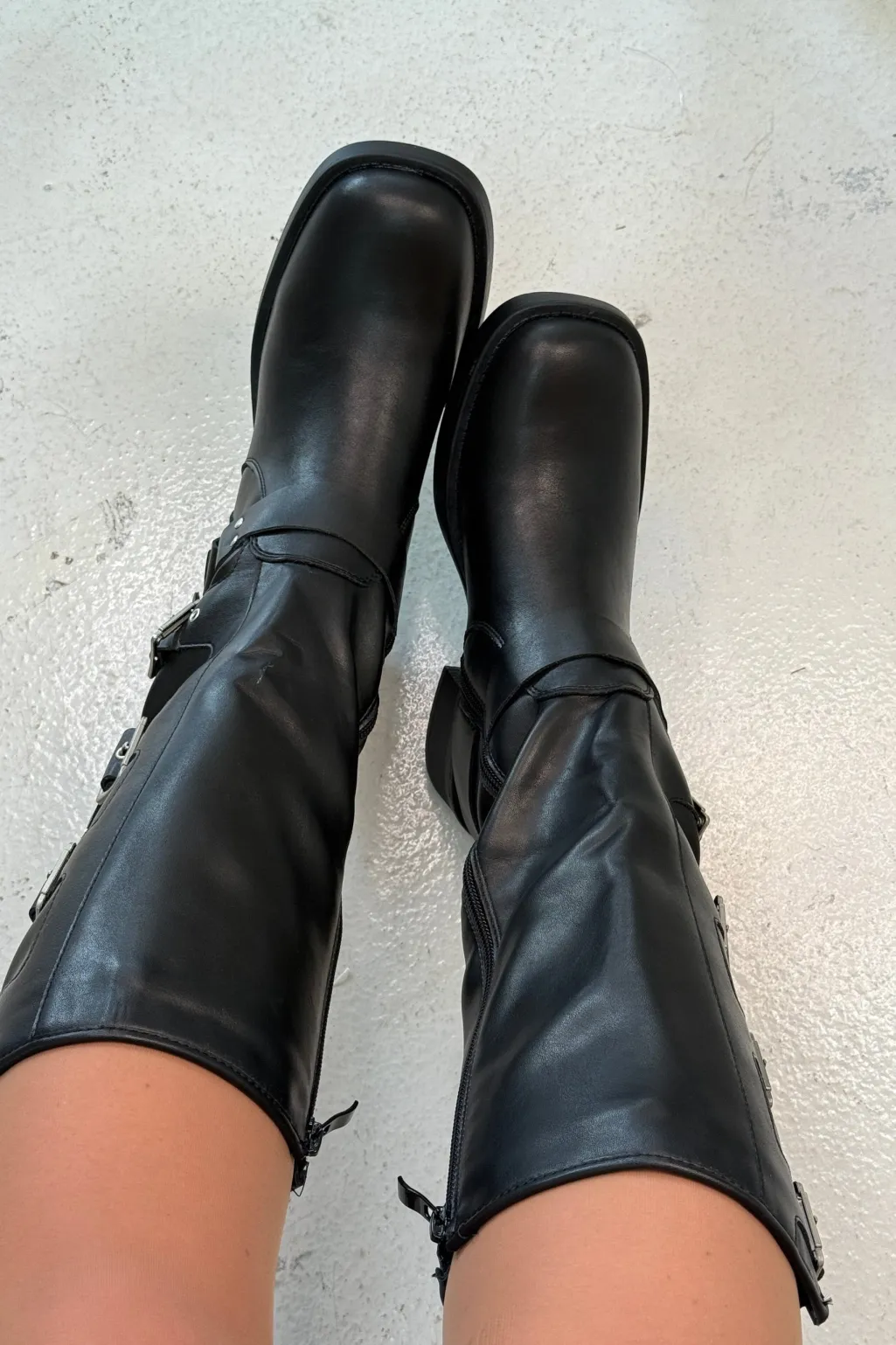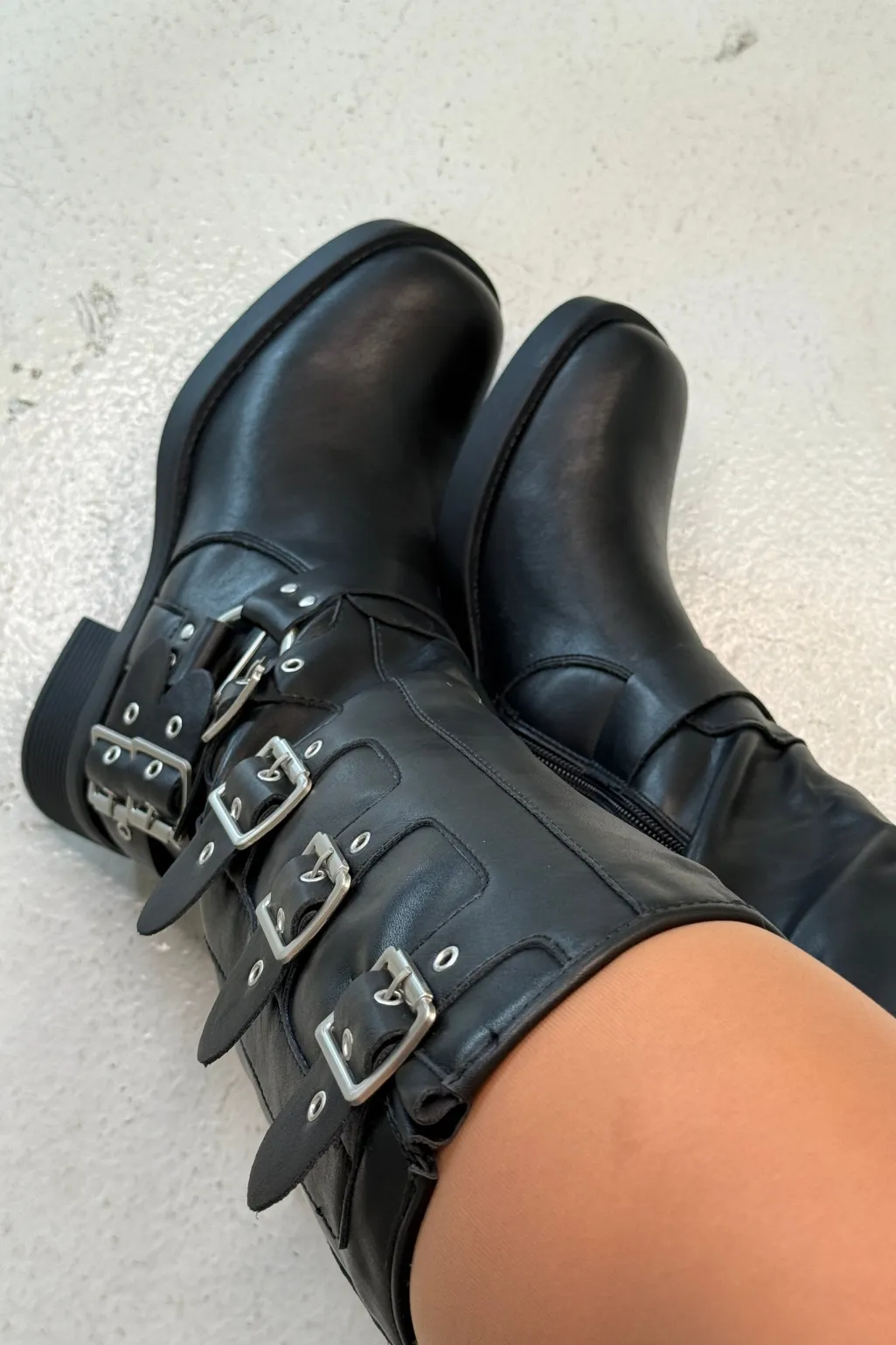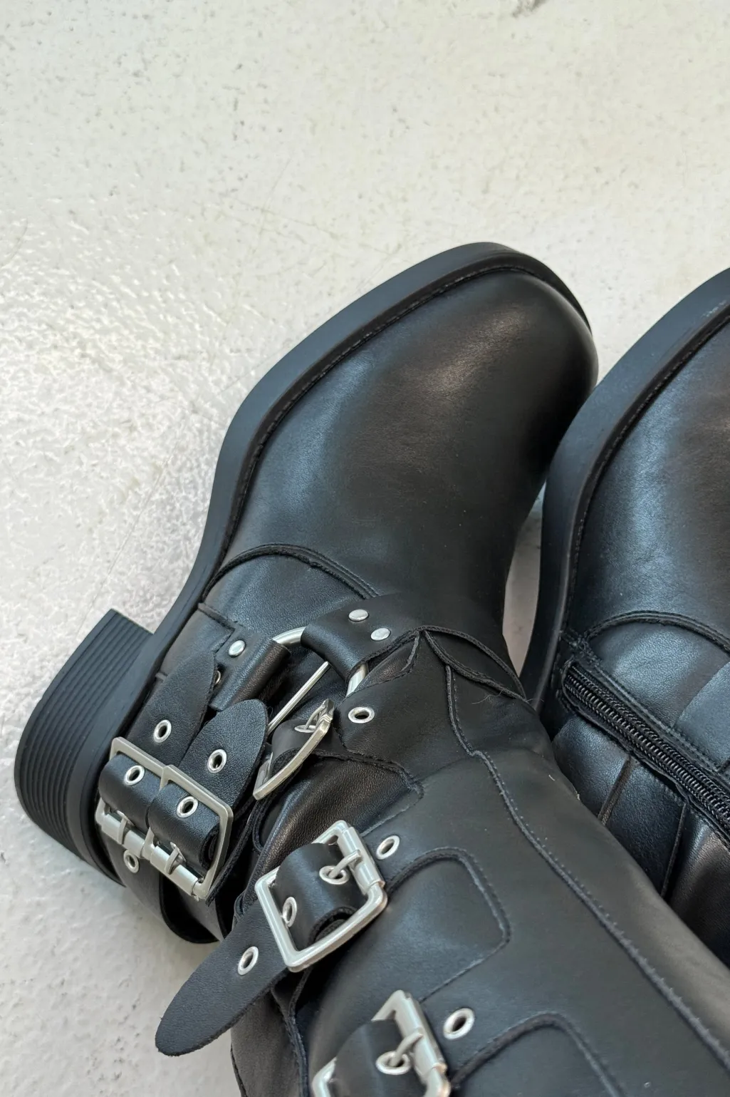 Sorte støvler fra Bloom, lavet af 100 % syntetisk materiale. Støvlerne har en block heel og en kombination af lynlås og spænder.