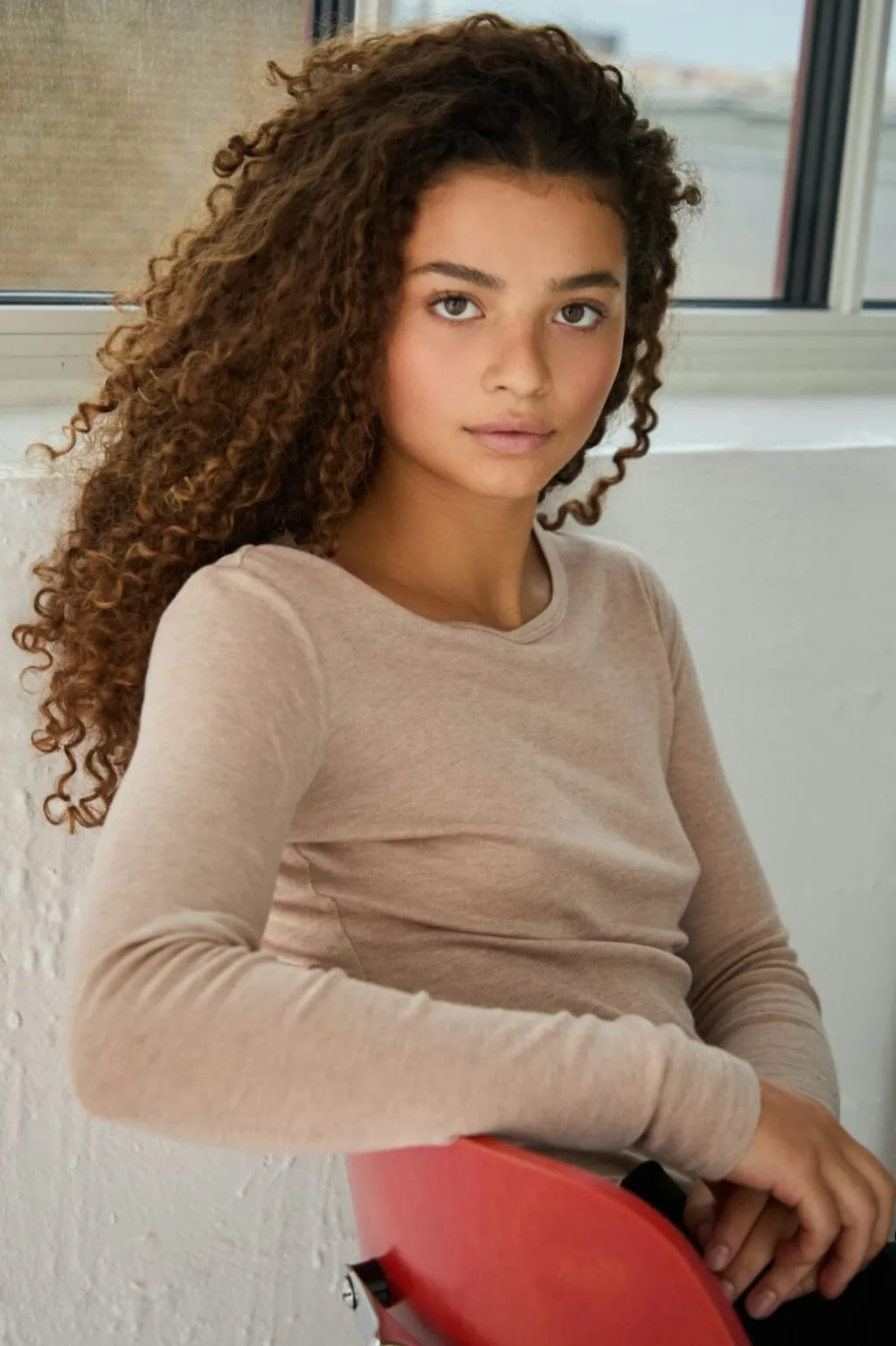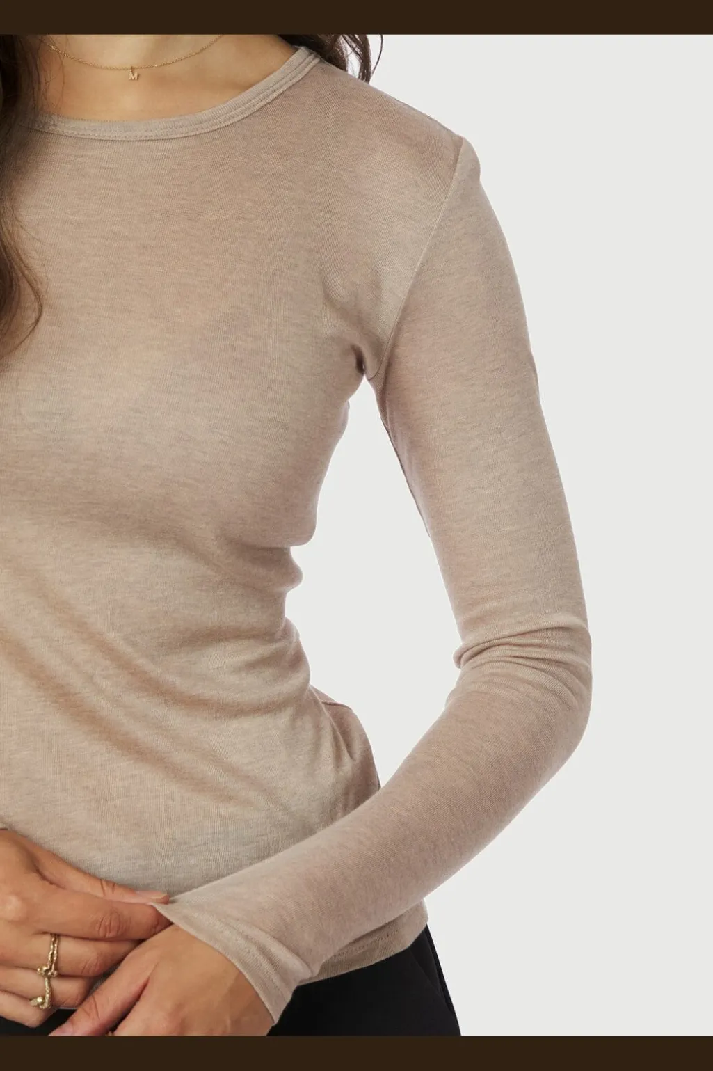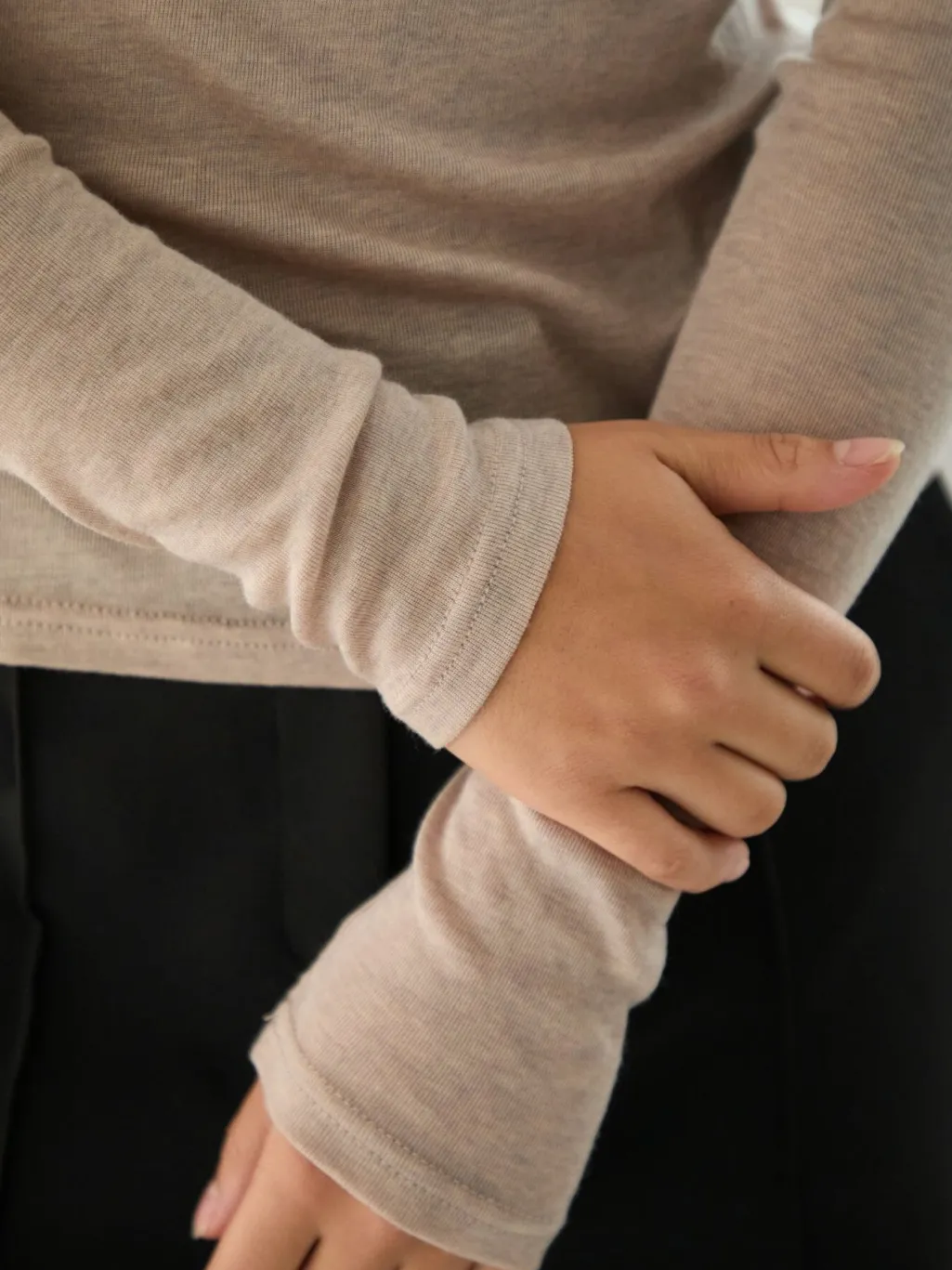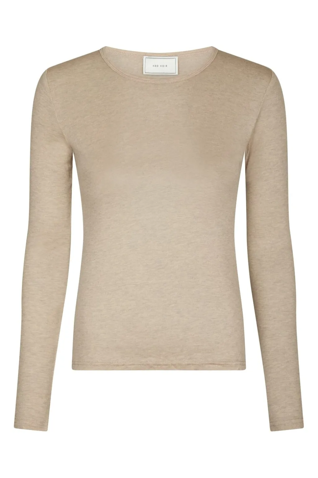 Beige melange-bluse fra Neo Noir i ribstrikket materiale. En kropsnær bluse med rund halsudskæring og lange ærmer i en neutral farve, der matcher mange andre farver.