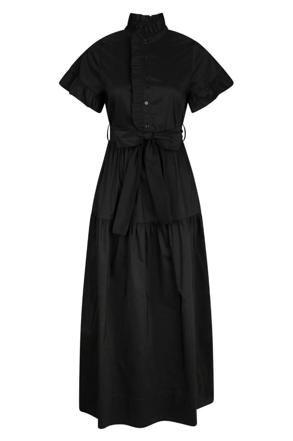Sort poplinkjole med høj hals og korte ærmer. Kjolen har knaplukning foran og rynket krave med flæsedetaljer. Et bindebånd i taljen og smock-detalje bagpå giver mulighed for at tilpasse pasformen.